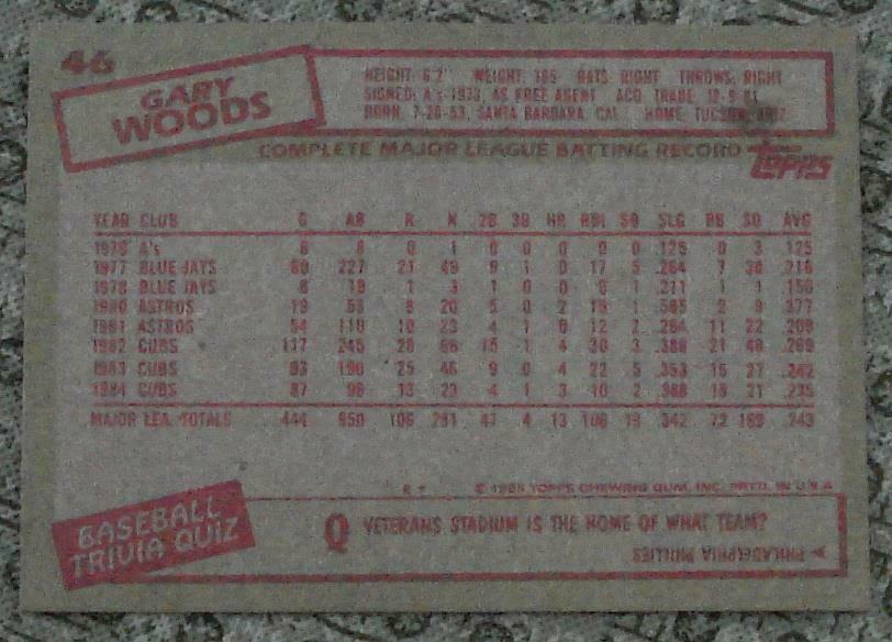 Gary Woods, Cubs, 1985 #46 Topps Baseball Card GDC - GREAT CARD