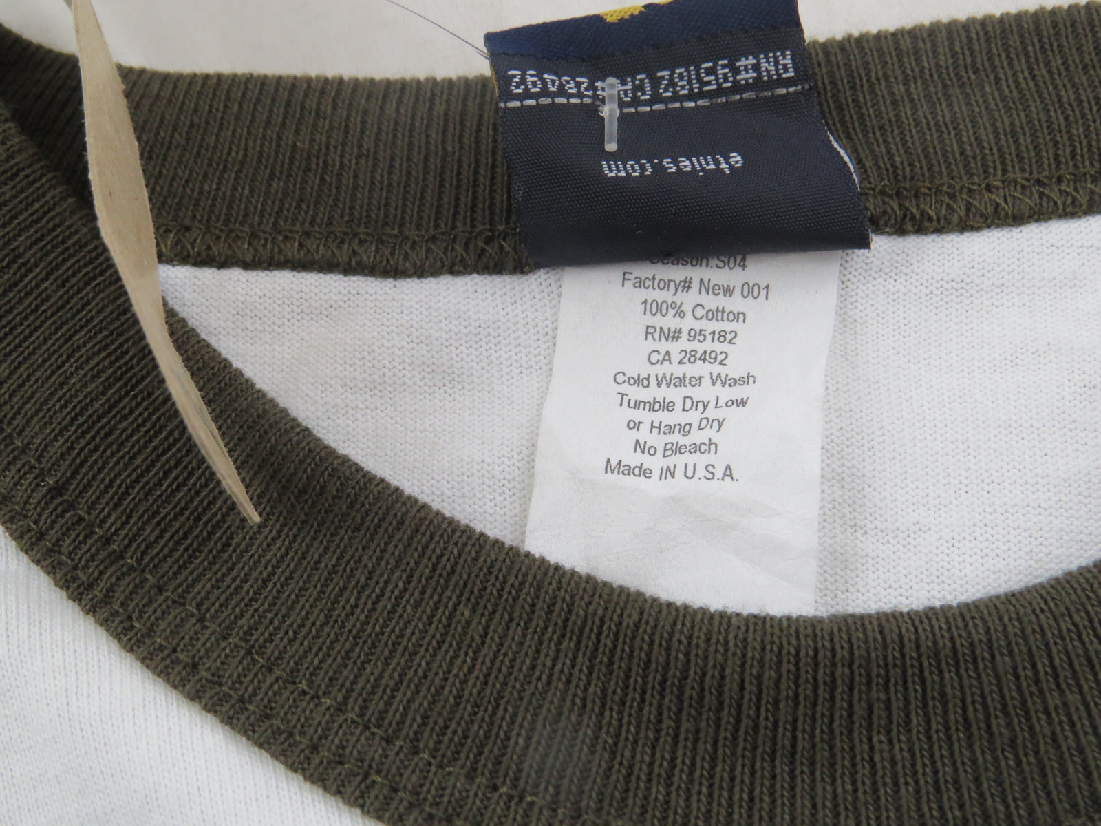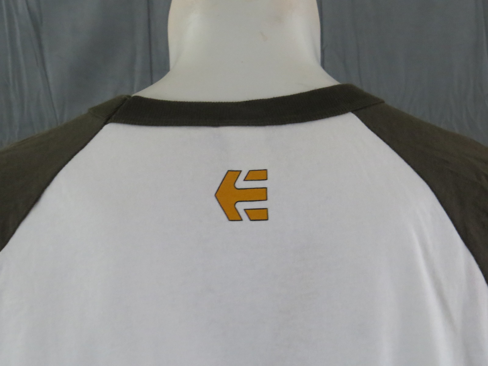 Up for sale is a vintage Etnies shirt. It has a white body with brown raglan sleeves. The front of the shirt has the Etnies word mark and E logo screened on. The left-arm has the Etnies E logo screened on in yellow. What an amazing vintage shirt do not miss out on it.
