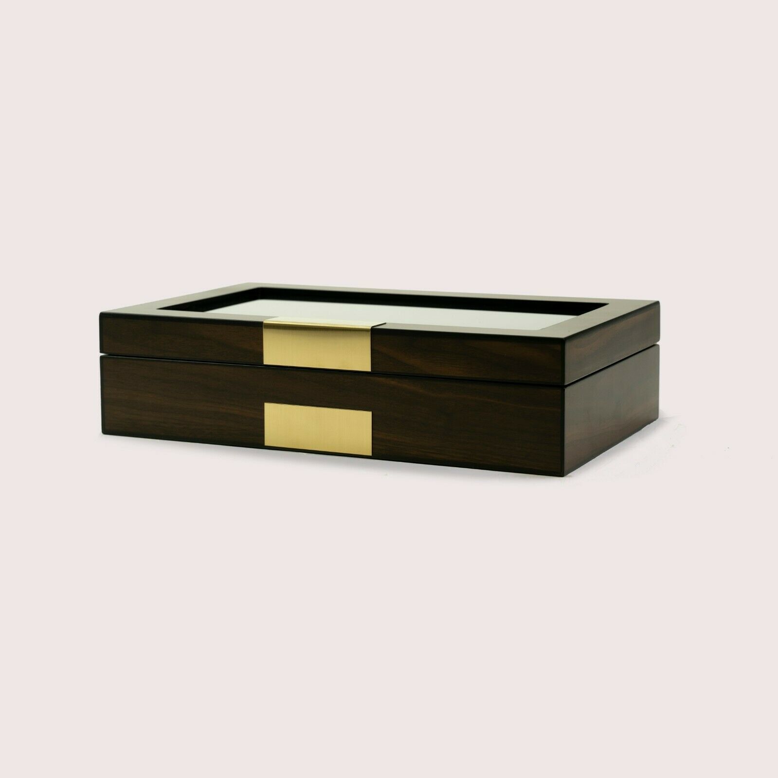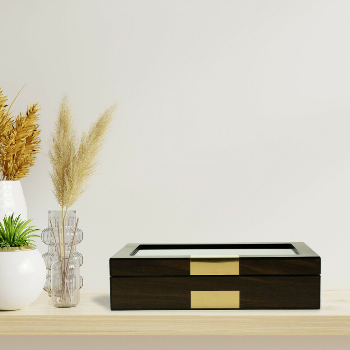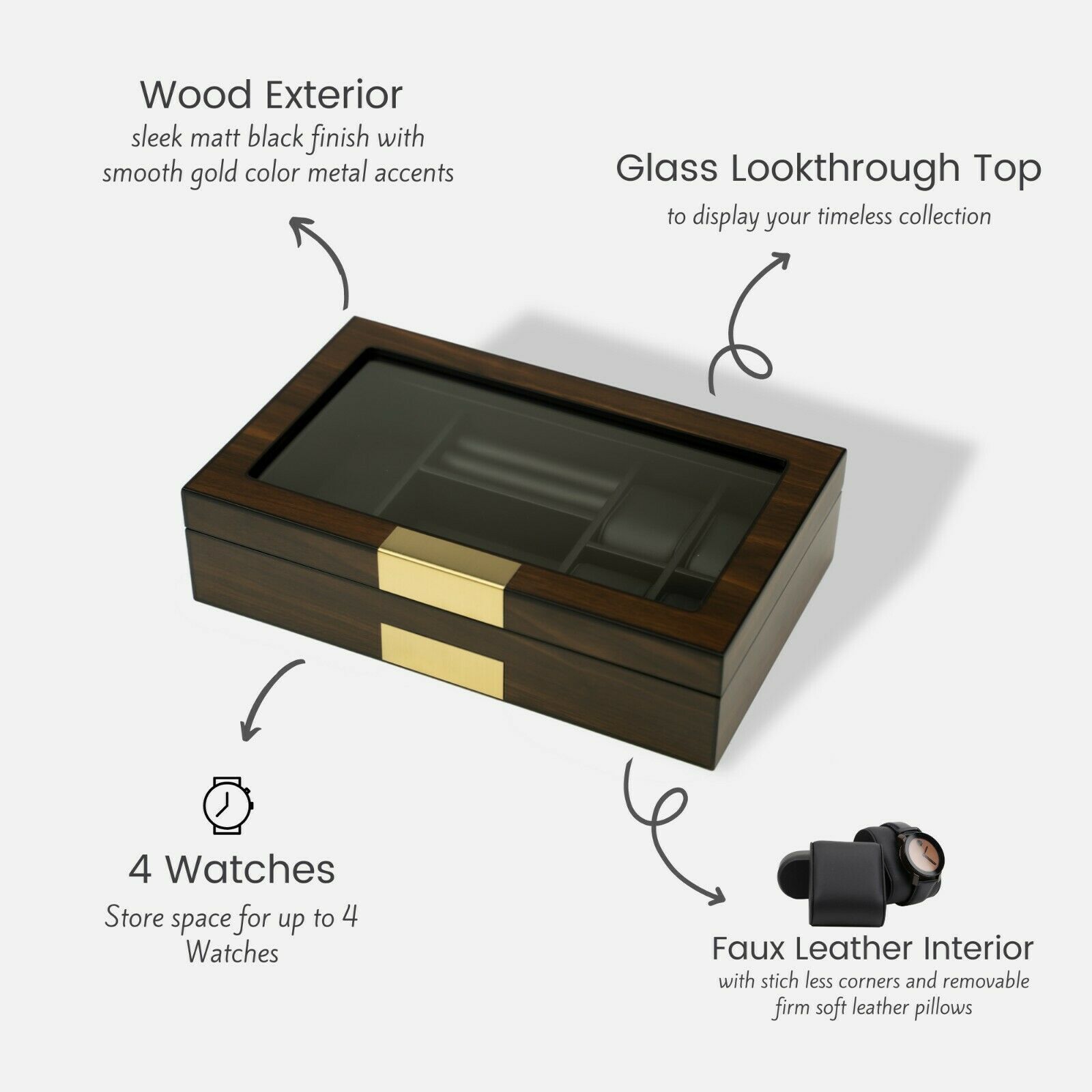 DecorLove Forever Multi-Purpose Luxury Watch, Cufflink Jewelry Organizer with Spacious and secure, the Love Forever is the ultimate watch and jewelry organizer for both men and women, Convenient and practical with storage space for 4 watches, sunglasses, rings, cufflinks and more, Enhance appearance of dresser with its sleek dark wood exterior and smooth gold metal accents, Protects your expensive watches from dust, falls, scratches and getting lost. Quality built to last with stitch less corners and sturdy walls. Both classy and elegant, this watch organizer is also a perfect gift idea for your family, friends, or co-workers