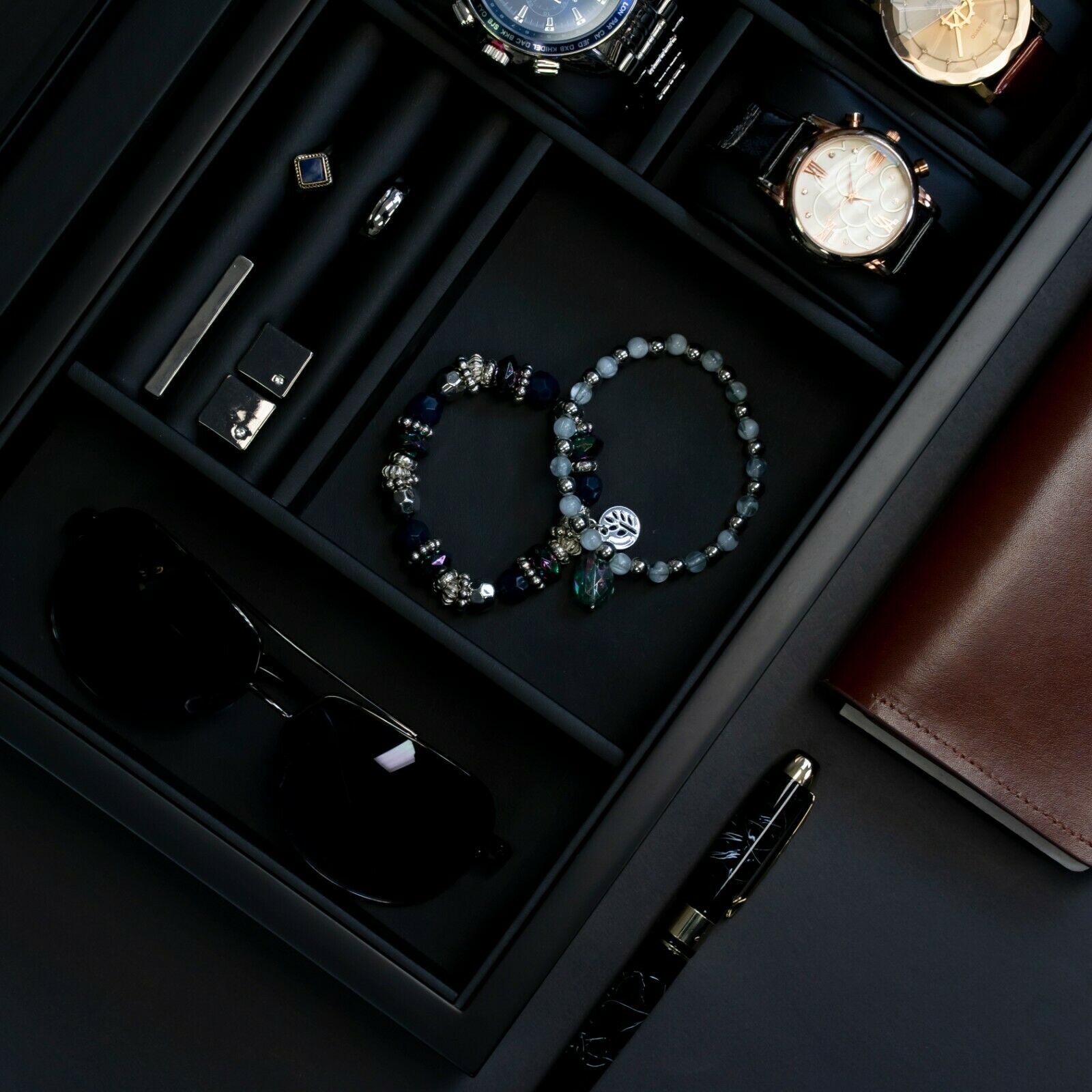 SuperStar: All Your Jewelry in One Place! The SuperStar features separate storage space for 6 watches, an additional compartment for other bracelets or watches, 11 padded rows for rings, cufflinks, tie pins, and earrings and an additional drawer for 6 sunglasses or prescription glasses. You no longer need to store your watches, sunglasses or jewelry in individual boxes or fish through a messy drawer. With the Busy Man you can organize and display your watch collection in style