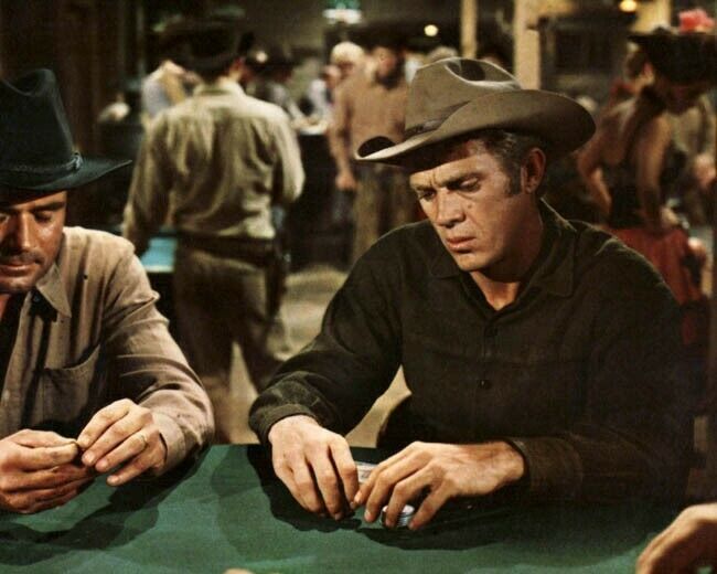 Steve McQueen sits gambling playing cards in saloon Nevada Smith 8x10 photo