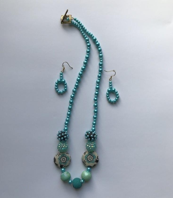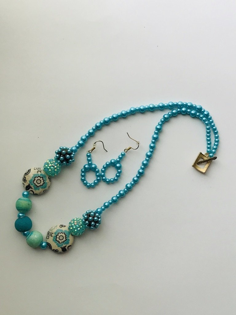 radiant teal stringed glass beads with 5 different types of contrasting design, yet matching color style glass, stone and with metal type beads. necklace is 21in long end to end, earrings are 1.75in in length and .75in wide. decorative gold colored toggle clasp for necklace.