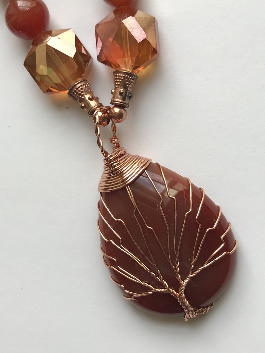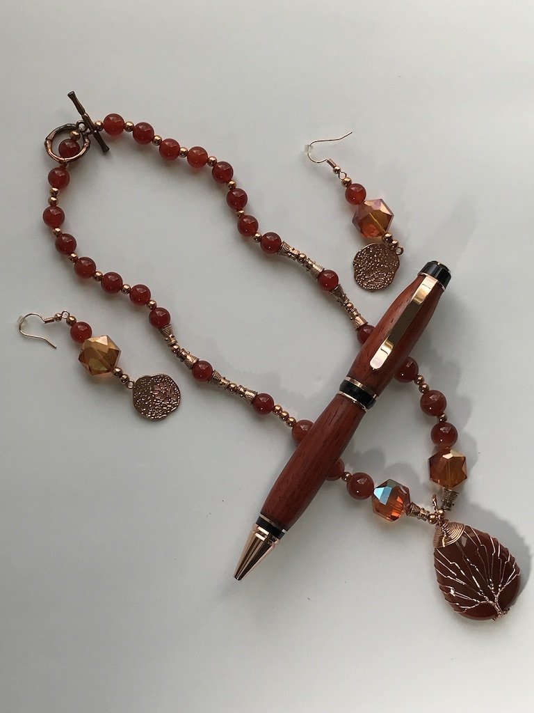 copper wired tree-themed centerpiece with rust-colored glass beads 22in necklace and matching decorative 2.75in earrings. *pen not included*