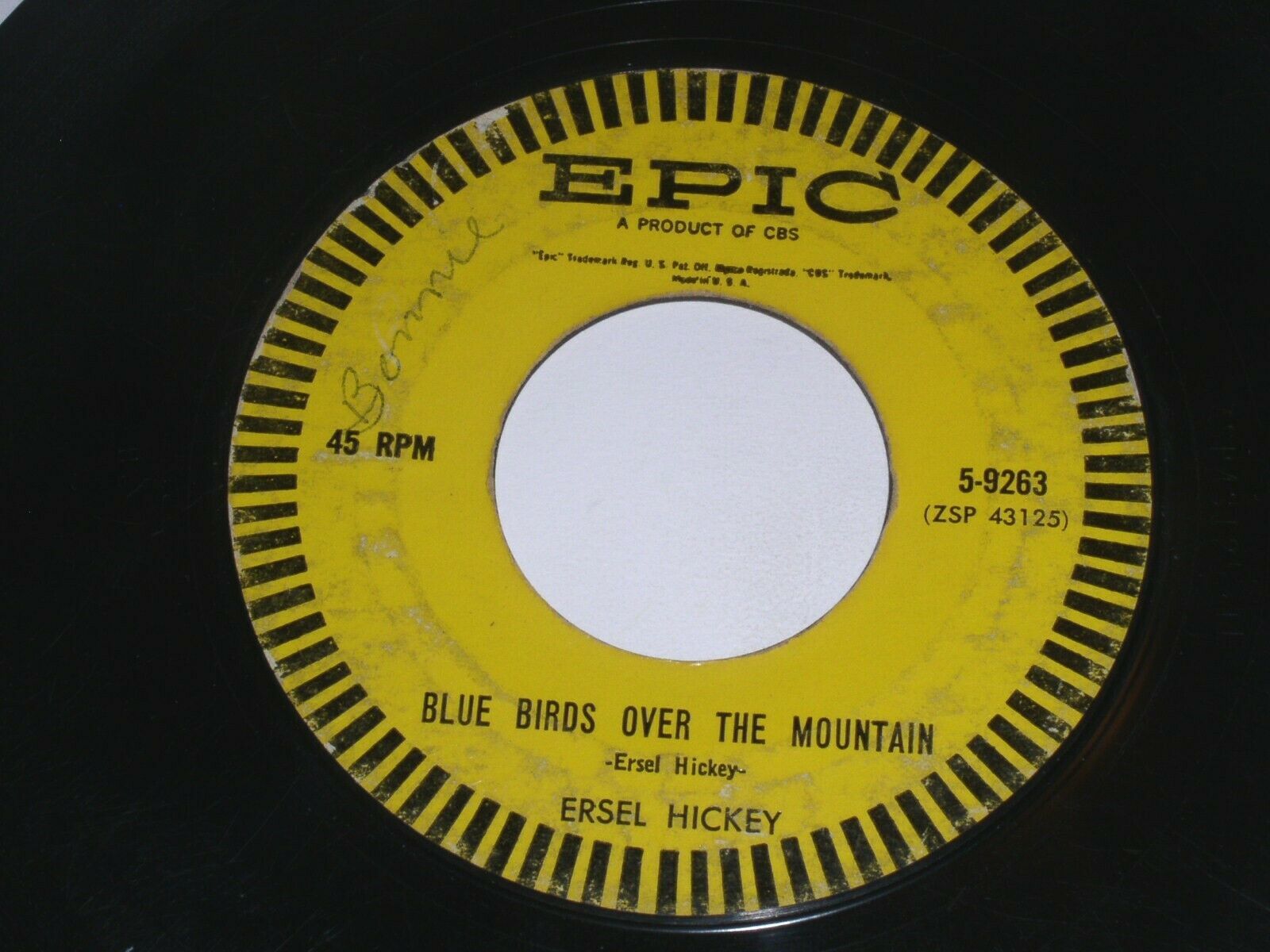 This is an original, vintage 45 rpm phonograph record by Ersel Hickey entitled, "Blue Birds Over The Mountain". Flipside: "Hangin' Around". Record label Epic 5-9263.