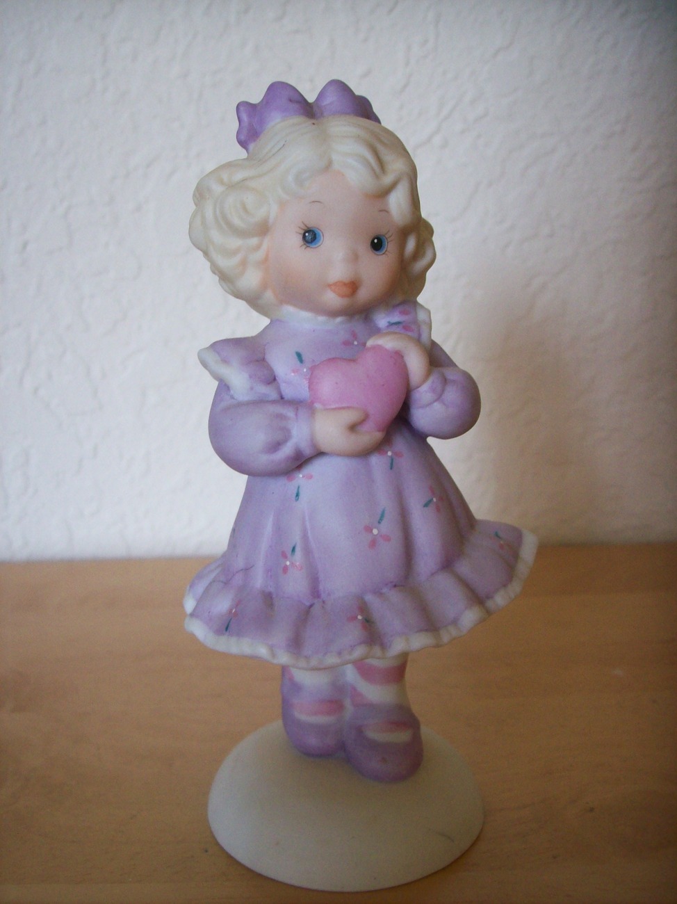 1992 Enesco Sisters Best Friends “A Friend is Someone……”Figurine. Out of box in good condition. Beautiful blonde girl with purple dress with pink flowers and pink heart in hand. Bottom reads "A friend is someone who knows you by heart!"