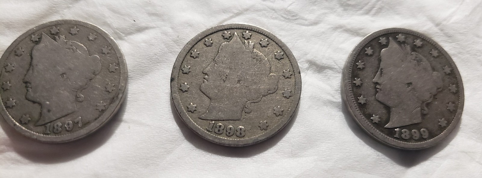 These are three old "V" Liberty Nickels 1897, 1898, 1899. Condition: About Good.