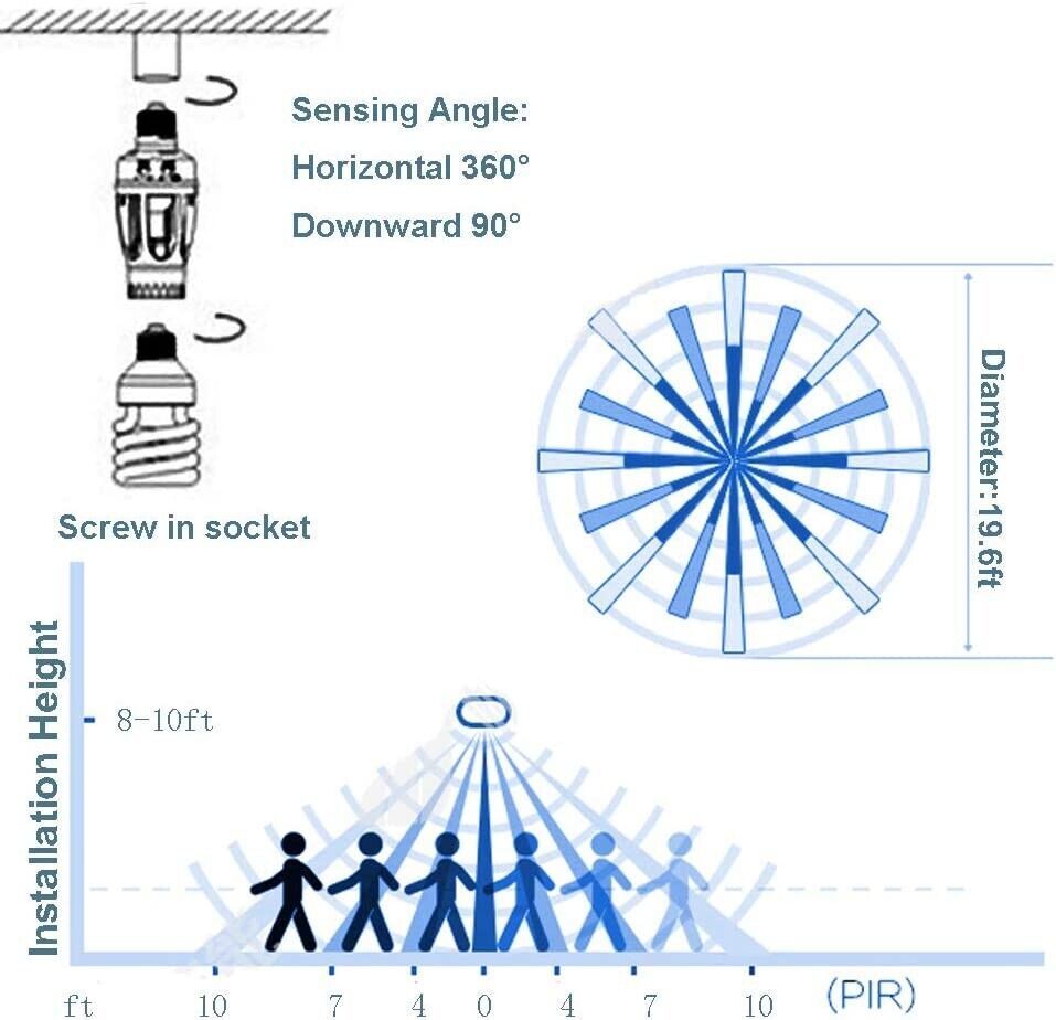 ?Sensitive IR Motion Sensor Light Socket: When the motion sensor light socket is connected to any E26 / E27 bulbs, it will turn on and delay off within the sensing range (6-16ft) automatically by sensing the body temperature.