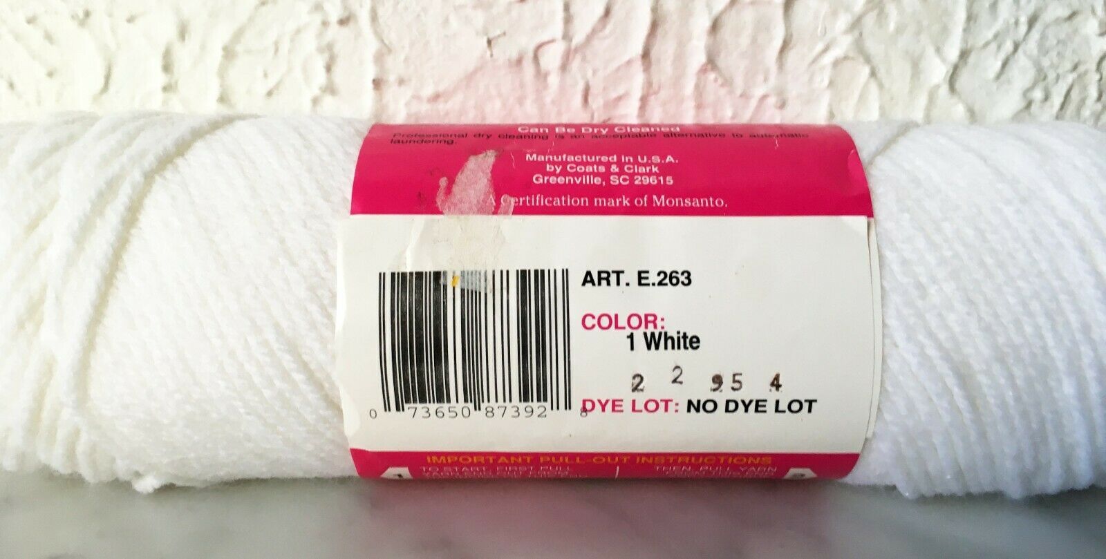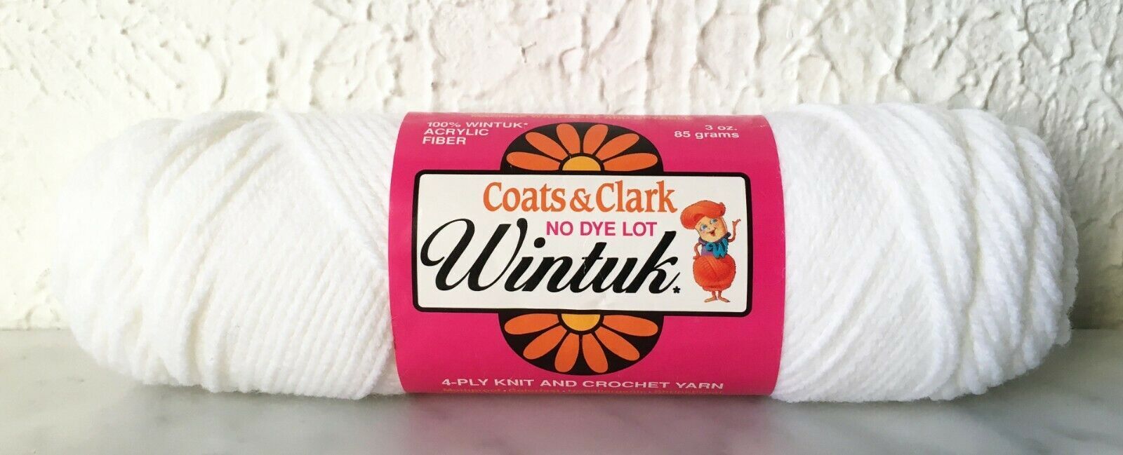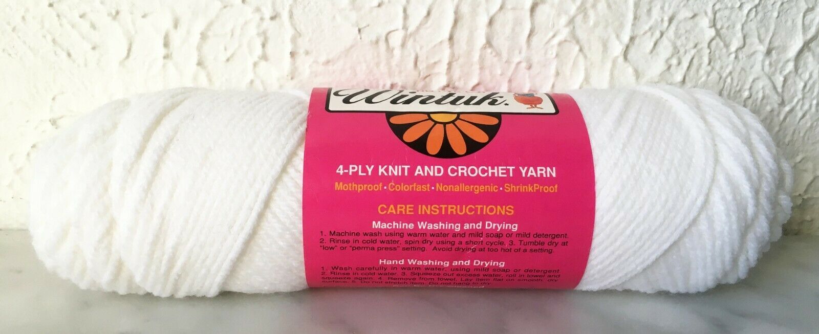 One skein of vintage Coats Clark's Red Heart Wintuk 4 ply hand knitting yarn. Color White #1. No dye lot. 100% Acrylic, machine wash and dry. Made in USA.