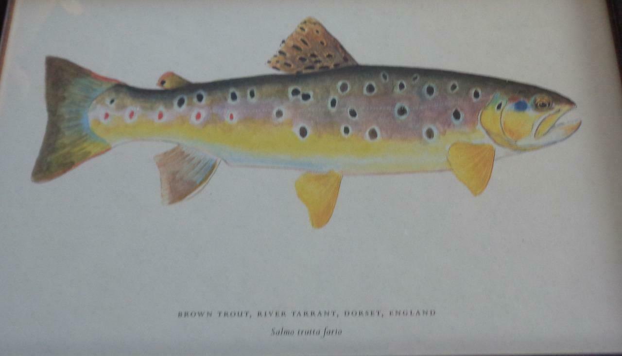 Offered here is this nice professionally framed artwork print. The print features the Brown Trout of the River Tarrant in Dorset England. The print also features the Latin name of this type of fish. I am unsure of the age of the print, or of the artist who originally created the piece. The print is professionally framed, and is in particularly good condition, with truly little sign of use or wear at all. The back of the frame still has the cardboard packing over the hanging wire. The entire piece is 7.5” from top to bottom, and 11” wide. It is a genuinely nice artwork print, in excellent condition. It would look great on any sportsman or fisherman wall.