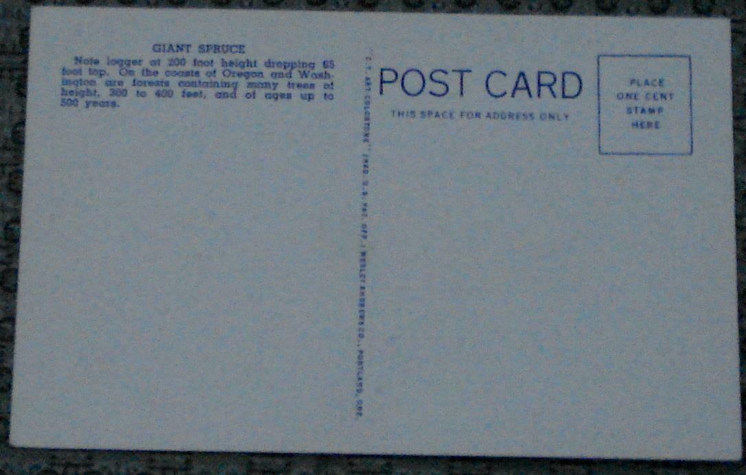 You are bidding on this nice Color Tone postcard, Topping Giant Spruce for 200 Foot Mast, Tree 265 Feet High. The postcard is in good condition, with some light wear at the corners and edges, and some light stains and yellowing on the back and front. There is some yellowing on the back on this card, and some moisture staining on the back and front of this card as well. The postcard is un-used postally, and has a caption on the back that reads; Giant Spruce, Note logger at 200 foot height dropping 65 foot top. On the coasts of Oregon and Washington are forests containing many trees of height, 300 to 400 feet, and of ages up to 500 yearsโฆIt is 3.5โ by 5.5โ and is a nice Color Tone postcard.