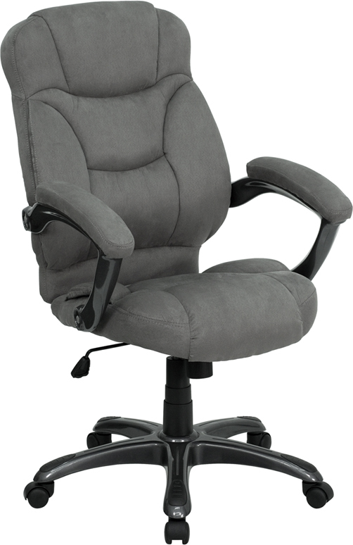 This gracefully designed chair features gray microfiber upholstery to comfortably get you through your work day or to keep you comfortable while browsing the internet. This chair features an ergonomically contoured back and seat and arms that are comfortably padded. High back office chairs extend to the upper back for greater support and relieve tension in the lower back, preventing long term strain. The contoured seat dissipates pressure points for greater comfort. The waterfall front seat edge removes pressure from the lower legs and improves circulation. The tilt lock mechanism rocks/tilts the chair and locks in an upright position while the tilt tension adjustment knob adjusts the chair's backward tilt resistance. Chair easily swivels 360 degrees to get the maximum use of your workspace without strain. The pneumatic adjustment lever will allow you to easily adjust the seat to your desired height. The titanium nylon base with black caps prevents feet from slipping when resting on chairs base. [GO-725-GY-GG] Dimensions: 27.5"W x 27.5"D x 41.5" - 45.25"H