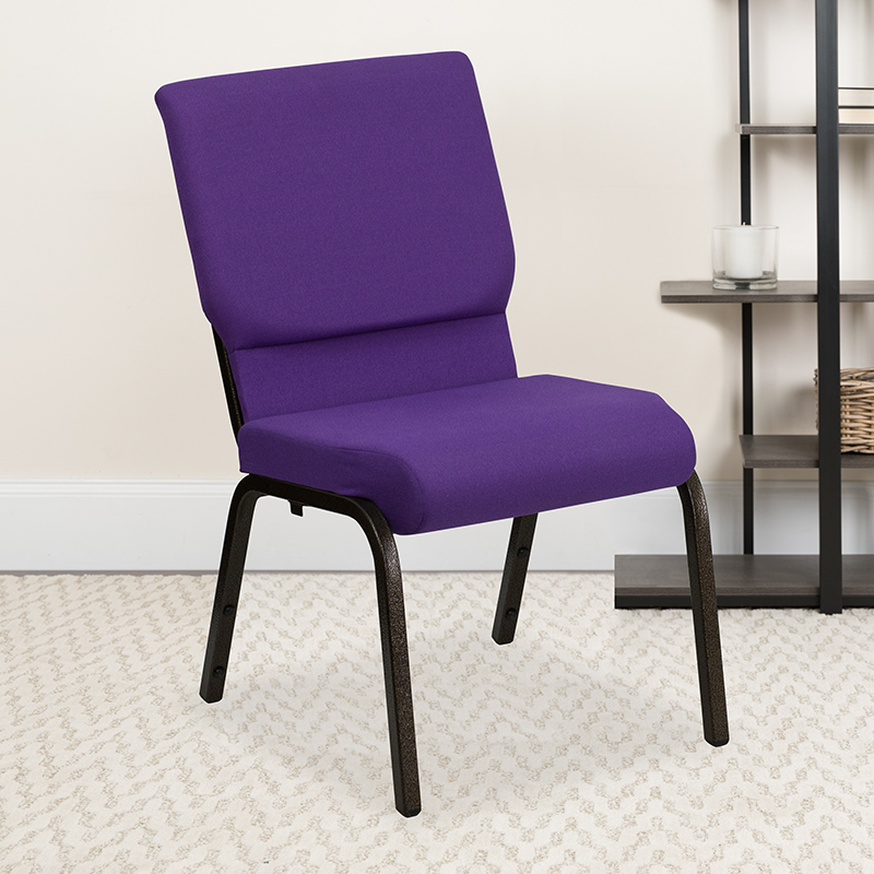 This beautiful church chair will keep your guests supremely comfortable whether you're hosting an all-day seminar, serving a 10 course meal or delivering your most inspirational sermon. This chair offers an advantage over pew seating with the flexibility of creating different seating configurations. The chair's cushioned back and 4" thick seat are generously padded and covered in durable fabric upholstery. The seat has a waterfall edge that reduces pressure on your attendees' legs. A convenient book pouch on the back of the chair keeps seminar materials, bibles or hymn books readily available. Built-in ganging brackets connect your chairs and maintain nice, straight rows. Its sturdy 16 gauge steel, gold vein frame, with gracefully angled legs, has been tested to hold up to 800 pounds and plastic rocker glides protect your floor by sliding smoothly when you need to move the chair. This Church Chair is an excellent option for hotel lobbies, banquet halls, conference facilities and worship centers. [XU-CH-60096-PU-GG] Dimensions: 19"W x 24"D x 33"H