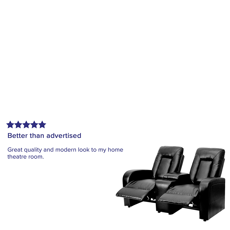 Spend some quality time with your family and friends for memorable movie nights, epic game days and legendary video game marathons, relaxing on this black home theater seating unit boasting soft and durable LeatherSoft upholstery. LeatherSoft is leather and polyurethane for added softness and durability. The ultimate in contemporary home theater seating, it features 2 push-back recliners with generous amounts of foam padding in the back and seat. The seat back has an integrated headrest for extra comfort. This recliner unit has 2 cup holders for your favorite beverages, and a storage console for remote controls, magazines and game controllers. Plastic floor glides protect your floor by sliding smoothly when you need to move it. When you have home theater seating, you can make every game day an event that rivals the Big Game; treat your friends to a cinematic experience; and challenge your friends and family to a virtual duel! [BT-70259-2-BK-GG] Dimensions: 63"W x 38" - 68"D x 43.5"H