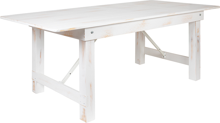 Set a stylish and rustic anchor in the heart of your home with this white rectangle dining room table where family can come together for delicious food and great conversation. Accommodate visiting guests with this extra-large rustic dining table that can comfortably seat up to eight people. Pins provide extra stability while in use, pull out the pins to fold the legs for transport. With its solid pine construction our beautiful farm table is suitable for daily use in restaurant and hospitality industries. To keep in spotless condition, use a water based cleaner and follow-up with a dry cloth. While constructed for indoor use, our transportable dining room table can be taken outdoors for special events like family get-togethers and backyard barbecues during good weather. Achieve country-rustic appeal by leaving the table as-is, or easily dress it up with a tablecloth for elegant events. [XA-F-84X40-WH-GG] Dimensions: 40.25"W x 84"D x 30"H