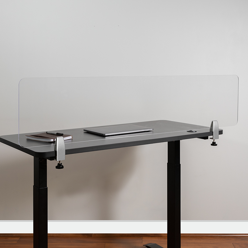 Protect employees, students and clients from bacteria and viruses with this clear acrylic desk shield. The use of a sneeze guard partition will help protect your office and teaching staff as well as students and customers by preventing the transmission of droplets. Great for school and office desks, this cough guard will create ways for individuals to have meaningful face to face conversations while helping to mitigate the risks. Adjustable clamps can be easily loosened and remounted in a different location when different configurations are needed. For those in high demand environments in close proximity to others, this shield is a must have. This clear desk shield is transparent to allow first hand discussions essential for student achievement and may help lessen the emotional toll of social distancing. Enable staff and students alike to maintain personal interactions for a more enjoyable work and school day. [BR-DDIA-30139-GG] Dimensions: 55.125"W x 0.25"D x 12"H