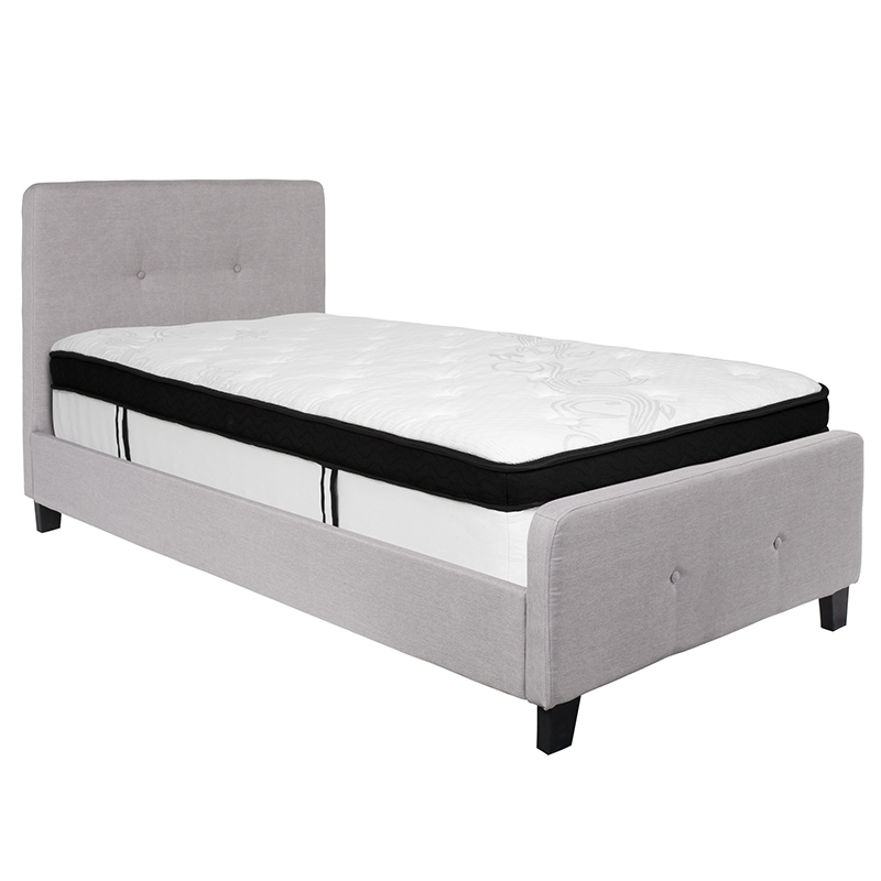 This modern low profile twin sized platform bed and mattress in a box set is all that you need to get your beauty rest. Designed to give your room an open concept feel, the headboard's height allow you to fill your wall space with pictures and wall art. The button tufted headboard and footboard adds an extra element of style. The mattress sits atop 14 wooden support slats. The 12" memory foam pocket spring mattress provides superior motion isolation and supports the contours of your body. The hybrid mattress consists of pocket spring coils and two layers of memory foam padding that provide a barrier between the springs for easy resting. The mattress instantly starts expanding once you cut the plastic and will return to its original shape in 2 to 5 days. This casually styled upholstered bed will fit in any kid's room or guest bedroom as a fashionable statement piece. [HG-BMF-25-GG] Dimensions: 42"W x 81"D x 40"H