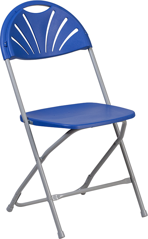 Imagine getting to setup these gorgeous fan back plastic folding chairs outside your venue where wedding ceremonies are held on sunny days as guests sit excitedly awaiting the arrival of the bride. Plastic folding chairs offer an easy seating solution for formal and informal events. Plan high tea, weddings, baby showers, and social events for clients. Folding chairs are more than ideal for the home to accommodate additional people during dinner parties, holidays, game nights, barbecues and book clubs. Their foldable design allows you to store them in your hall closet, garage or underneath furniture if you're tight on space. With an 18-gauge steel frame built to hold up to 650 pounds you'll have no problem seating all guests. Although designed for indoor use these foldable chairs have drain holes in the seat to prevent water from pooling during outdoor affairs and the textured seating surface is easy to clean after the most hectic events. Have your facilities manager stock plenty of these popular party chairs. After events these folding chairs stack on top of each other for compact storage, pair with a dolly to transfer between locations or keep them stored on the dolly. [LE-L-4-BL-GG] Dimensions: 17.5"W x 21.25"D x 35"H
