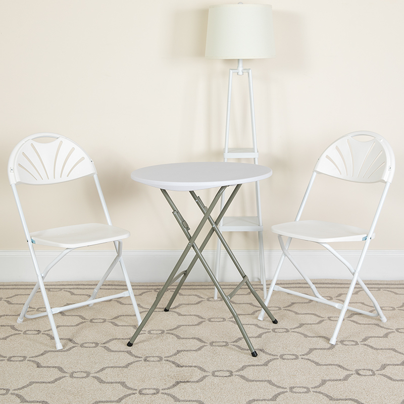 Imagine getting to setup these gorgeous fan back plastic folding chairs outside your venue where wedding ceremonies are held on sunny days as guests sit excitedly awaiting the arrival of the bride. Plastic folding chairs offer an easy seating solution for formal and informal events. Plan high tea, weddings, baby showers, and social events for clients. Folding chairs are more than ideal for the home to accommodate additional people during dinner parties, holidays, game nights, barbecues and book clubs. Their foldable design allows you to store them in your hall closet, garage or underneath furniture if you're tight on space. With an 18-gauge steel frame built to hold up to 650 pounds you'll have no problem seating all guests. Although designed for indoor use these foldable chairs have drain holes in the seat to prevent water from pooling during outdoor affairs and the textured seating surface is easy to clean after the most hectic events. Have your facilities manager stock plenty of these popular party chairs. After events these folding chairs stack on top of each other for compact storage, pair with a dolly to transfer between locations or keep them stored on the dolly. [LE-L-4-WHITE-GG] Dimensions: 17.5"W x 21.25"D x 35"H