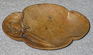 Adopt from Fathertime: Vintage Soapstone Carved Shallow Tray, China Marked, Middle section of tray about half light see threw. The tray is 5 inches long and at it's widest 3.5 inches, Scallaped Egg Shape with leaves and berry