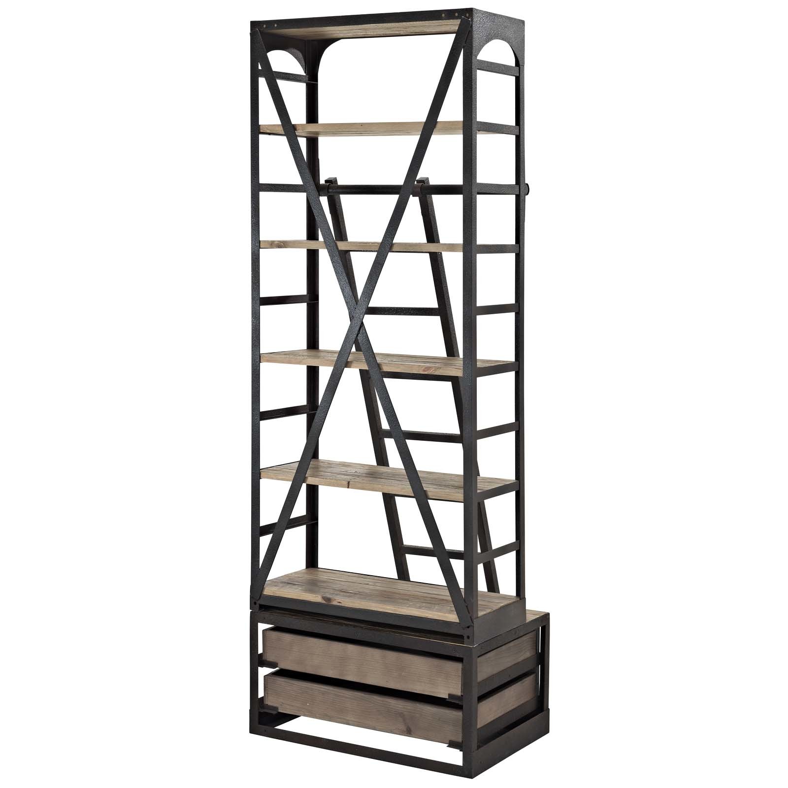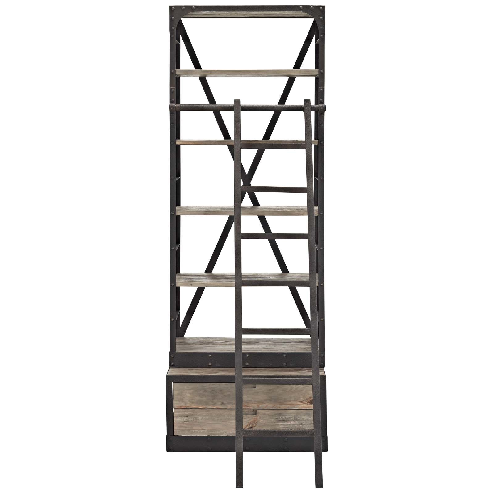 Depict the gentle flow of industrial modern decor with the Velocity shelving and ladder set. Constructed with solid pine wood shelves and a cast iron frame, Velocity admirably transports the onset of automation and assembly lines into our new era of discovery. The ladder is intentionally sold together to connote progress both on and off the shelf. Set Includes: One - Velocity Wood Stand