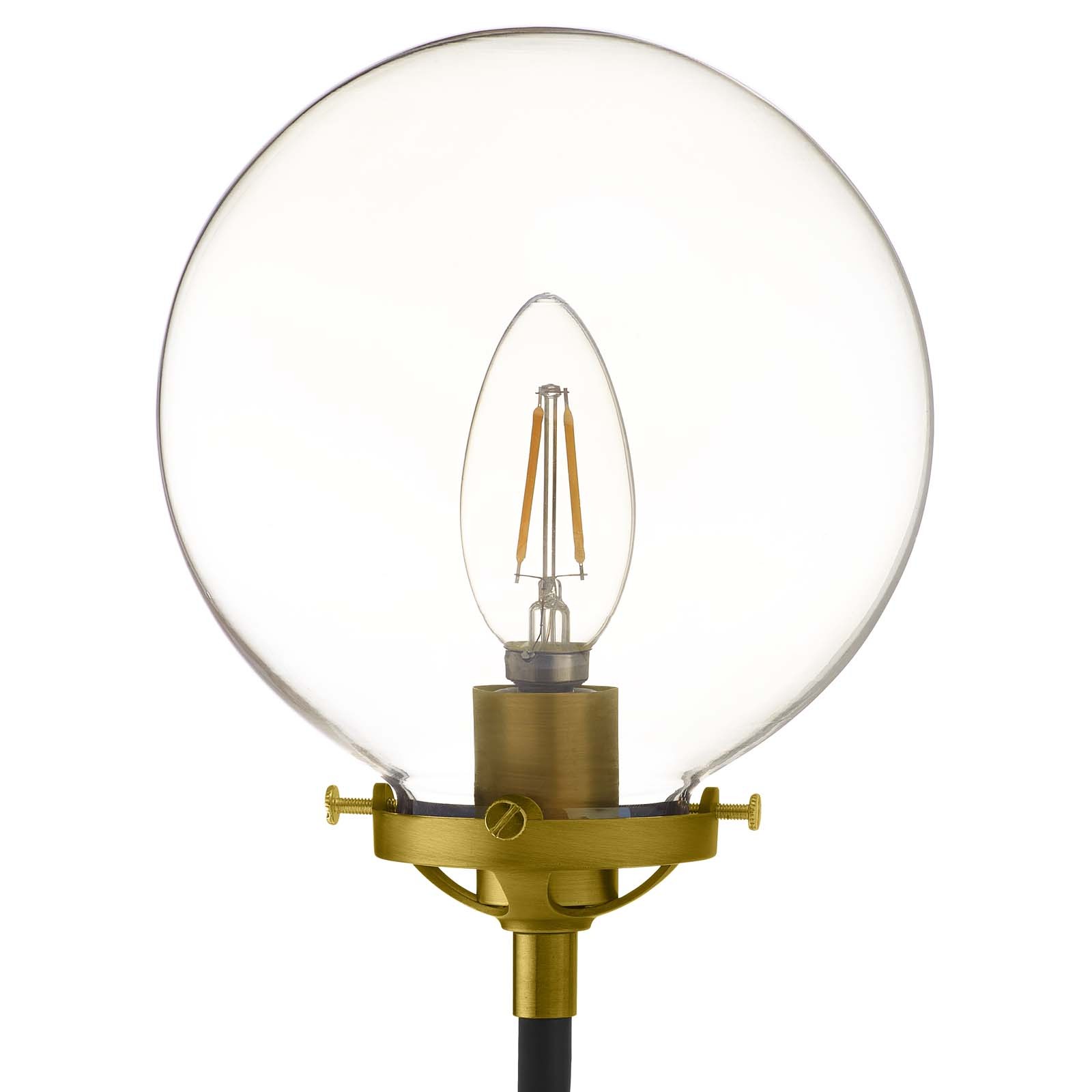 Illuminate your journey with the Reckon Sconce. Suspended by a brass black metal bracket, Reckon gives the appearance of a single exposed bulb while being safely contained within an amber glass globe. Inspiring rustic, modern farmhouse, and contemporary decors, enhance your entryway, bedroom, or living room with this versatile wall light. Set Includes: One - Reckon Amber Glass and Brass Wall Sconce Light