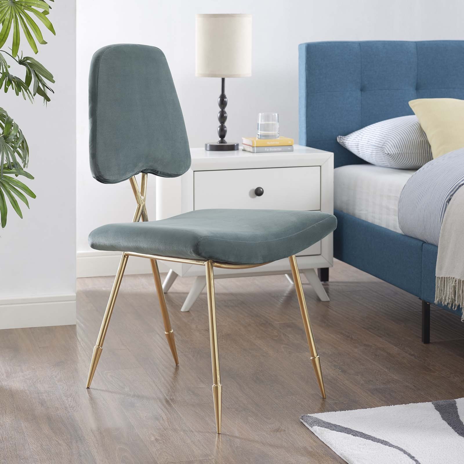 Energize your bed or living room decor with the Ponder Performance Velvet Valet Bench. Luxuriously tufted buttons adorn the soft, stain-resistant performance velvet polyester upholstery for an exquisite look of exceptional appeal. Easy on visual space and elegantly chic, Valet comes densely padded in foam with four gold stainless steel legs. The perfect addition to the modern home or apartment, instantly transform your room of choice with this exceptional piece. Set Includes: One - Ponder Upholstered Velvet Dining Side Chair