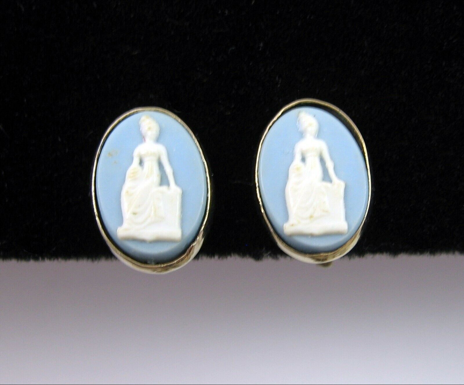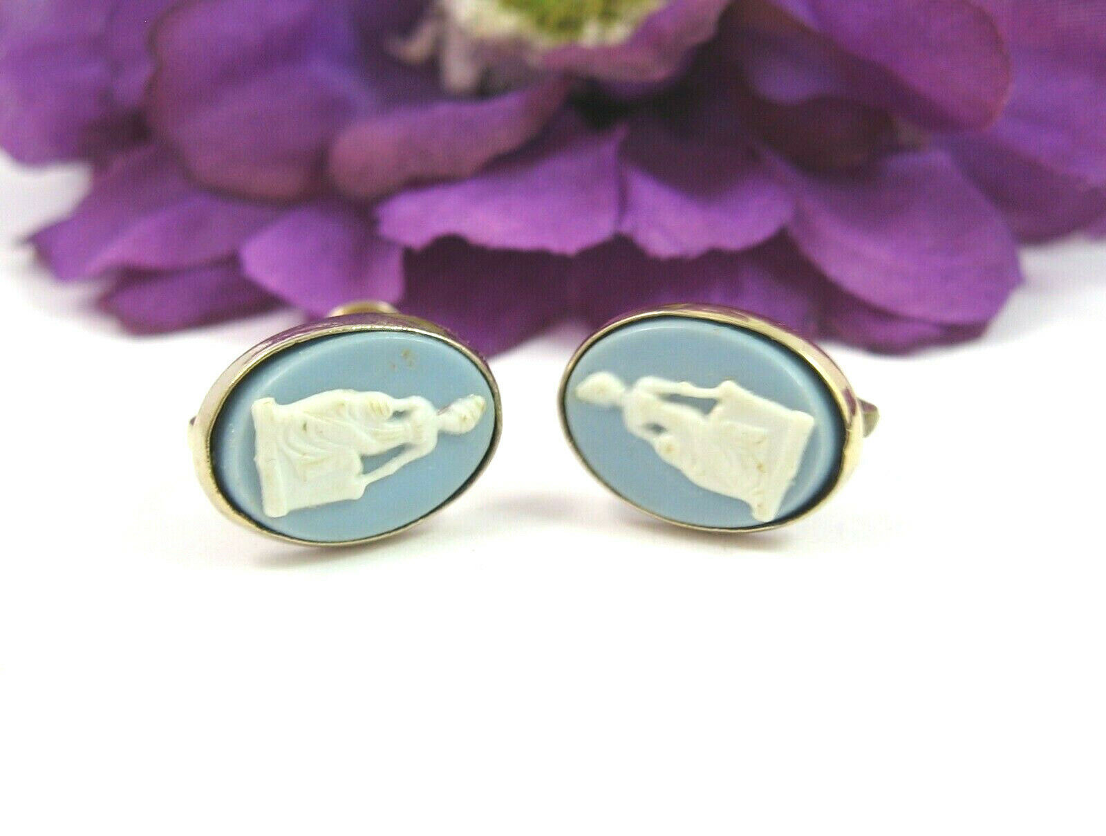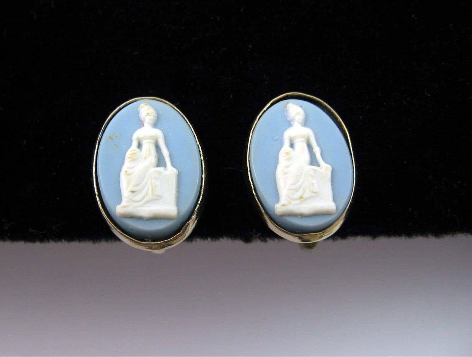 Light BLUE CAMEO EARRINGS Vintage Grecian Roman Woman Oval Screw Back Goldtone