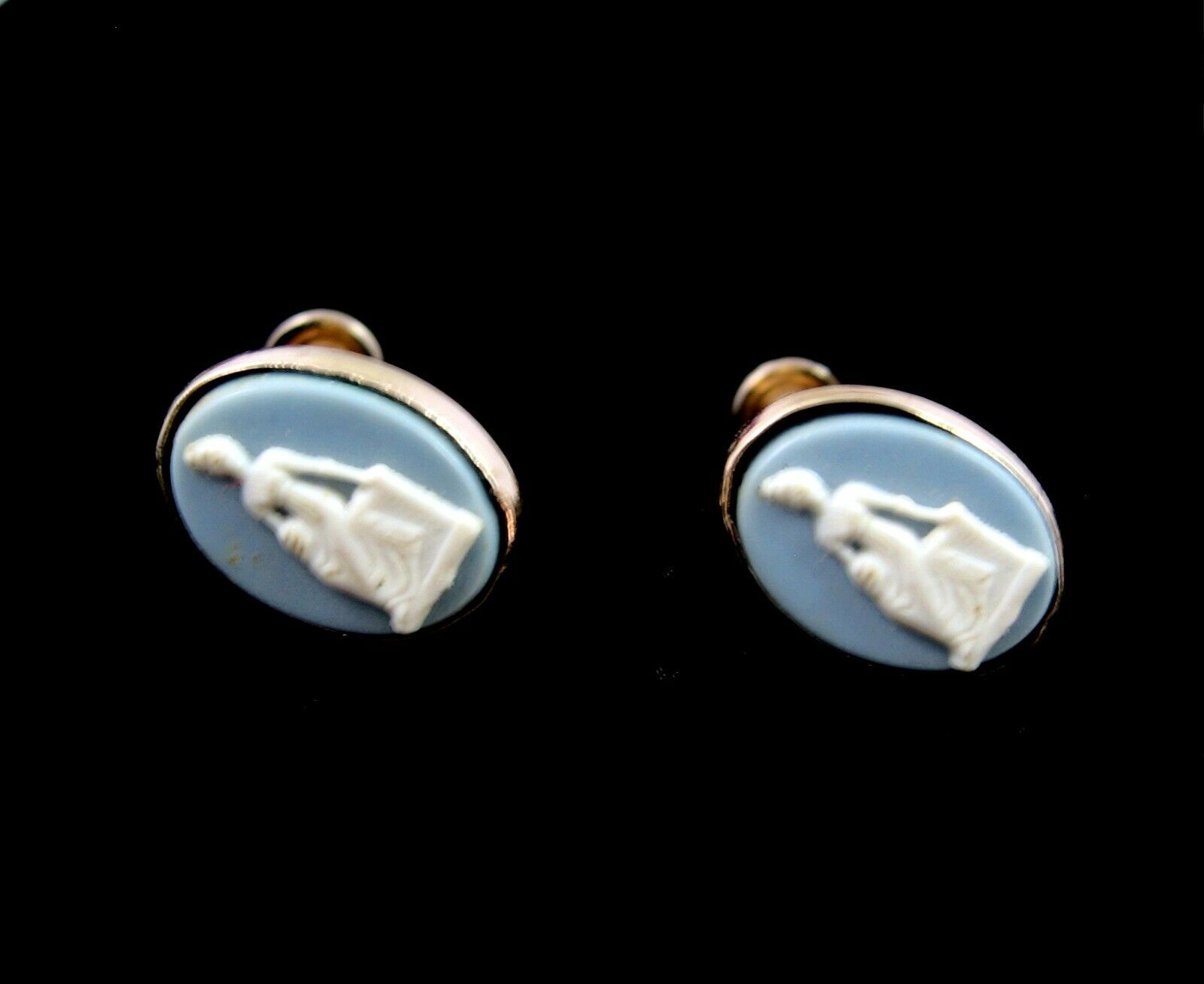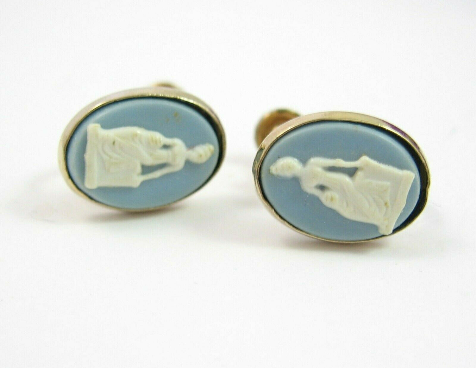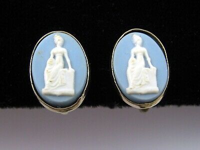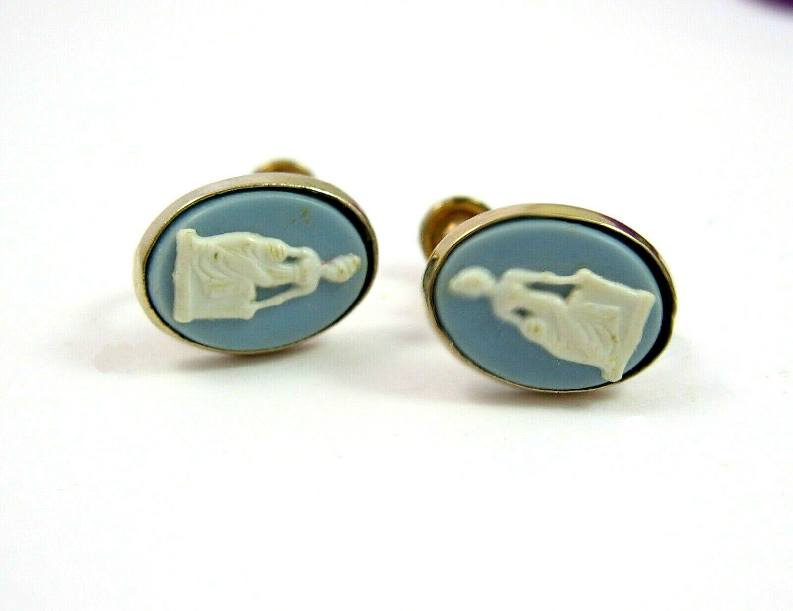 Light BLUE CAMEO EARRINGS Vintage Grecian Roman Woman Oval Screw Back Goldtone