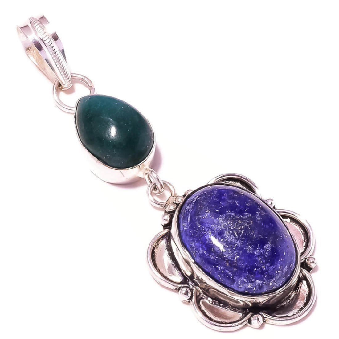 Lapis Lazuli, Emerald Gemstone 925 Silver Overlay Handmade Double Drop Pendant