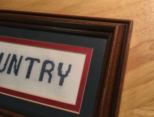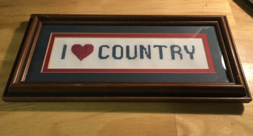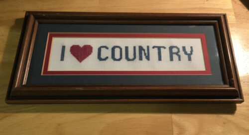 Framed matted I Heart Country Cross Stitch. Preowned in good condition. Measures 11 3/8 by 5 1/4 inches. Professionally framed and matted. Design and mats are in country blue and red.