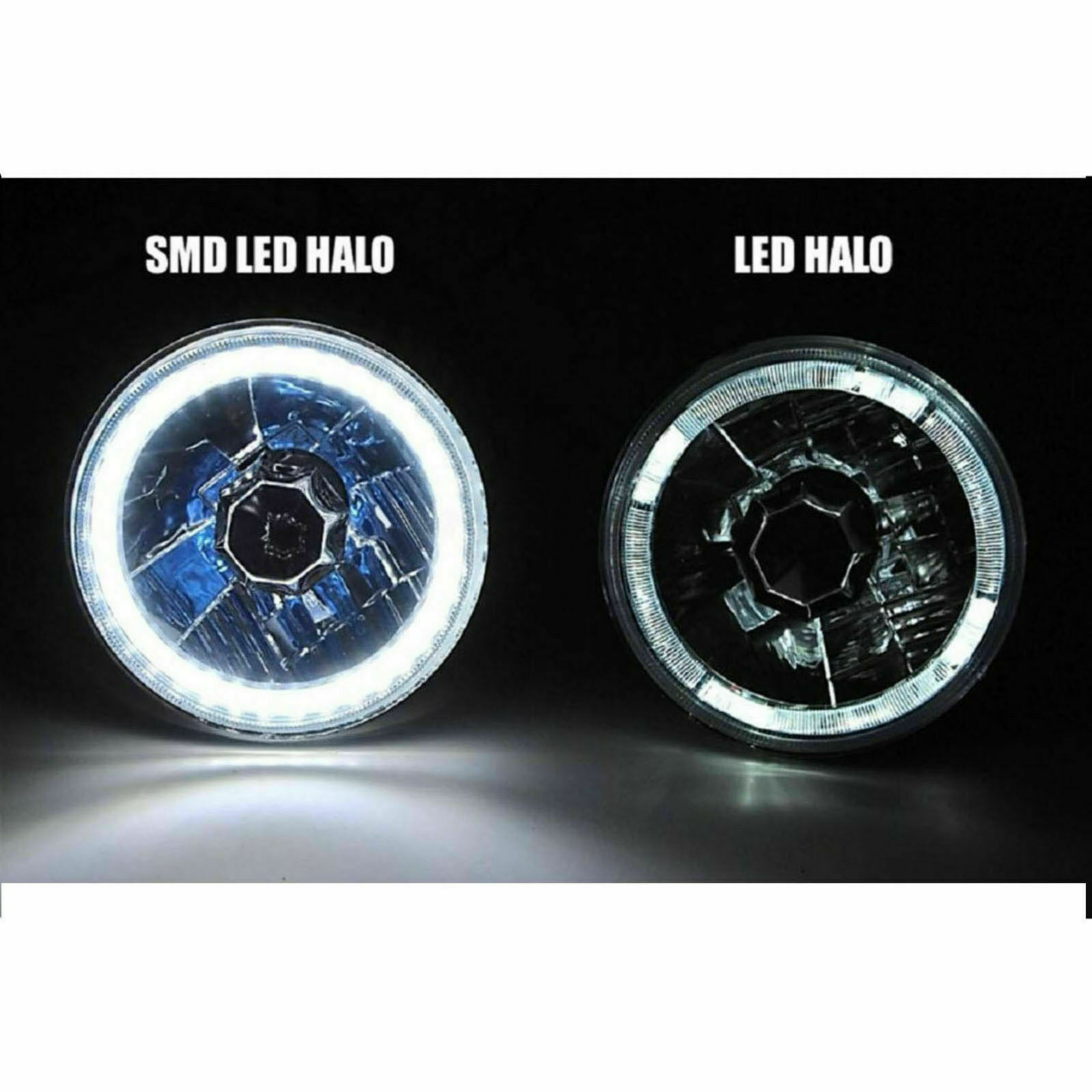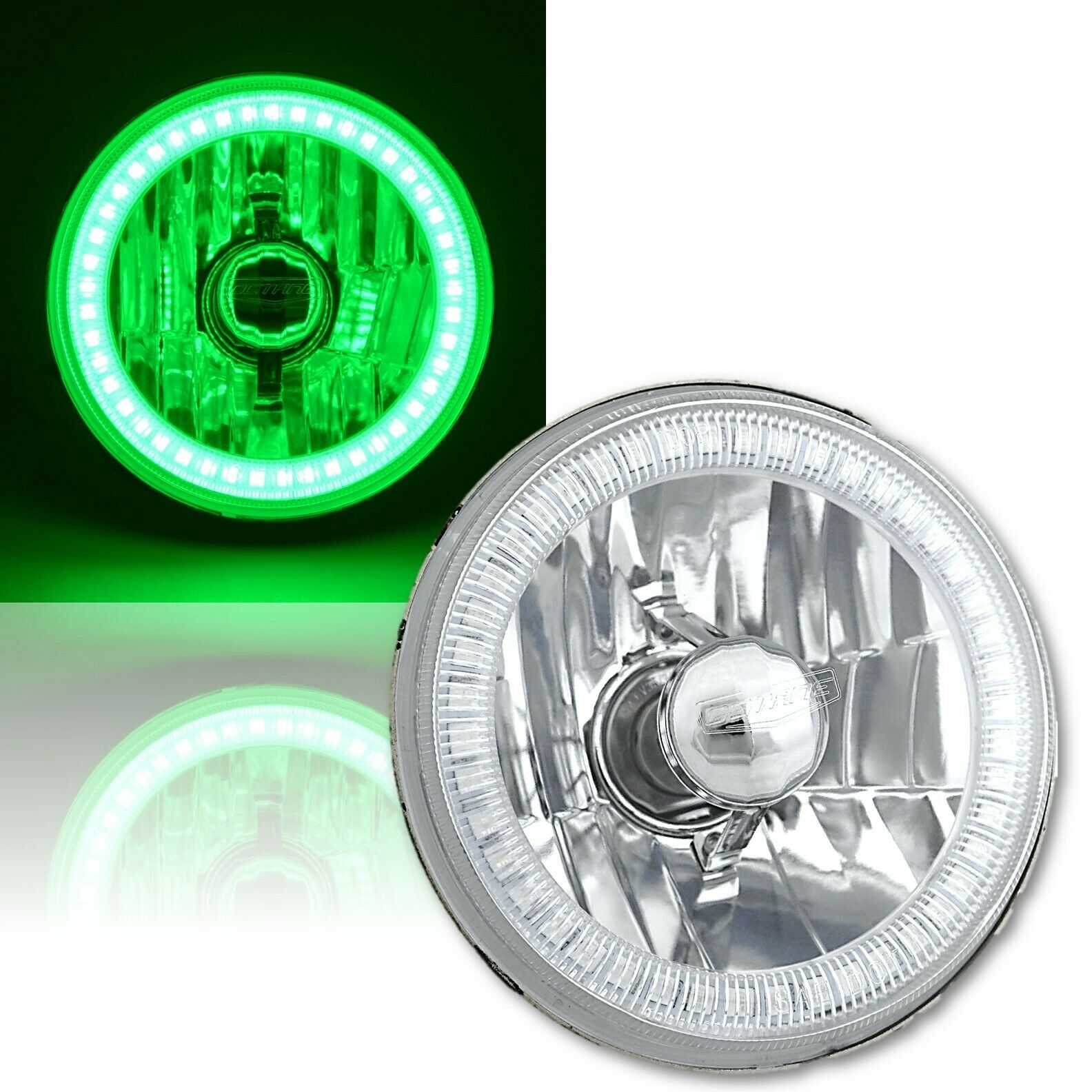 conversion headlight. Features a super bright SMD LED green halo ring and includes one 55/60w halogen super white light bulb. This is a glass faced / metal