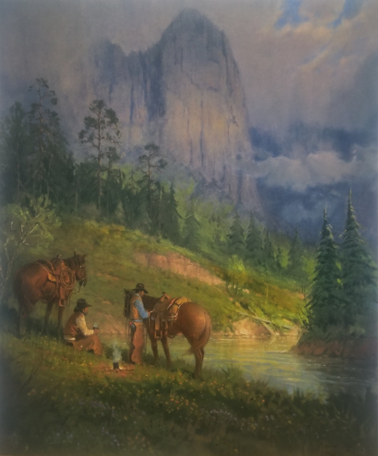 Cowboy Coffee, Signed and Numbered Serigraph by G Harvey Mountains Horses