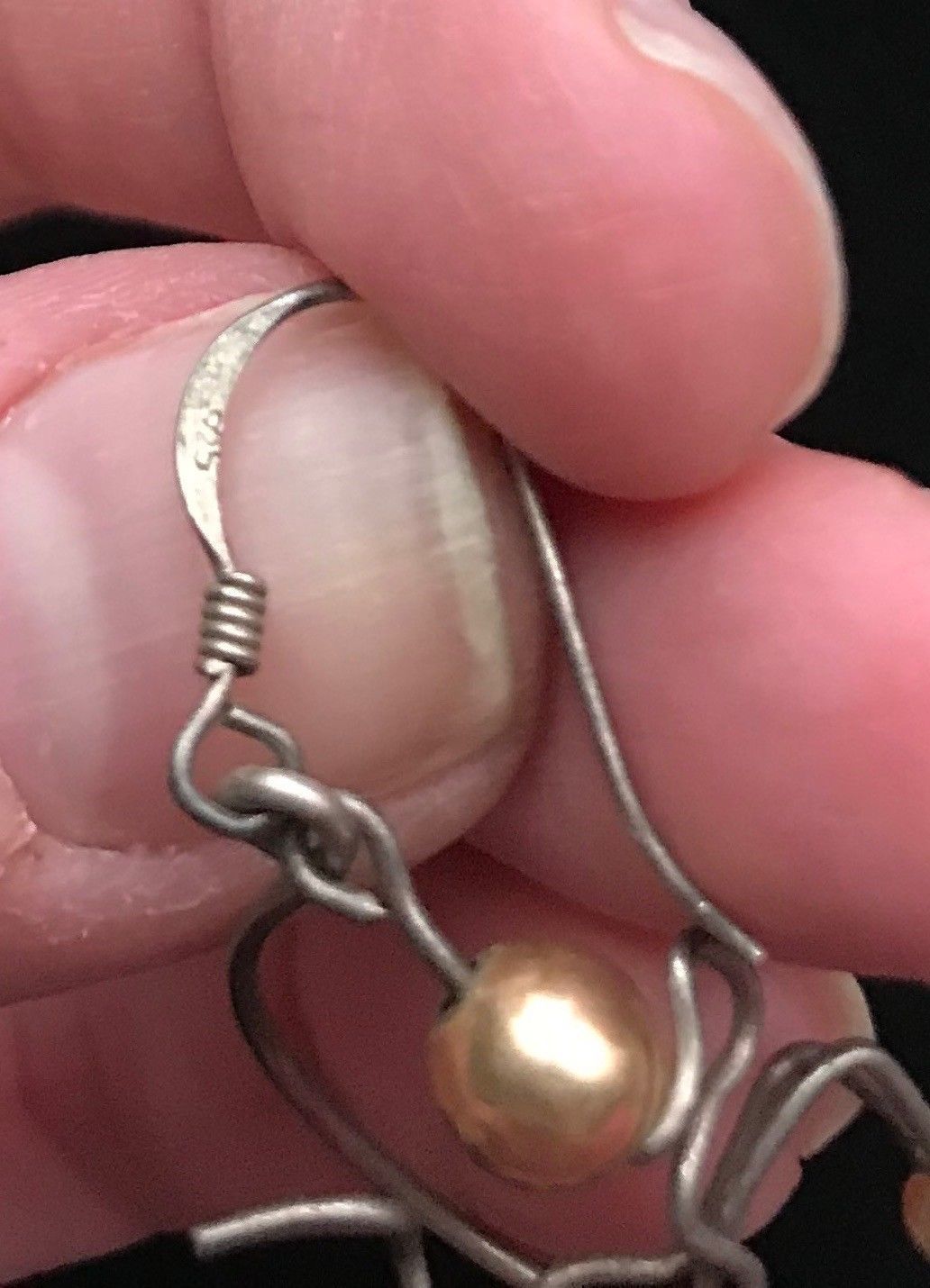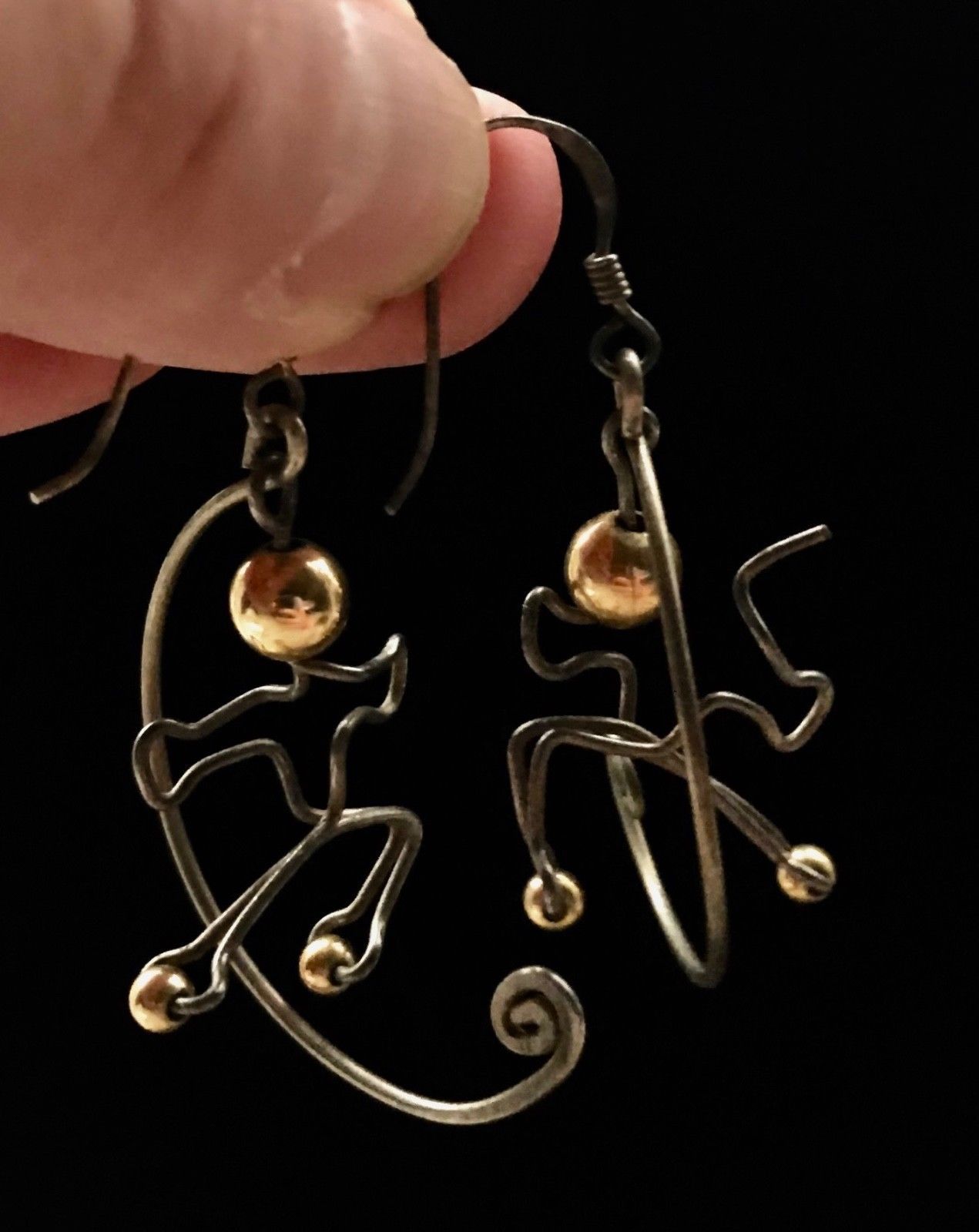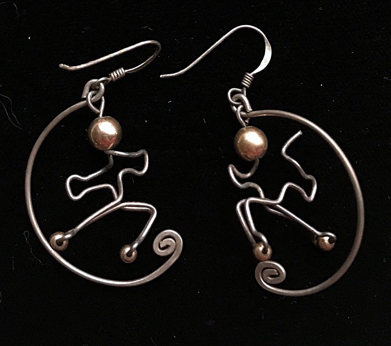 ABSTRACT - Sterling Silver RUNNER DANCER MODERNIST FIGURE Dangle EARRINGS. Marked 925 for Sterling Silver. Measures 2 inches long. Artisan made figures in Sterling Silver and Gold beads. UNIQUE EARRINGS!!!!