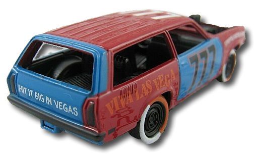 Description: Gloss Red w/Black interior; No windows; Black driver side door w/White ‘777’; Light Blue rear quarter w/White ‘Vegas Baby’; White ‘777’ on roof; Orange ‘What Happens In Vega, Stays In Vega’ on sides; Light Blue passenger door w/Black ‘777’; Orange ‘Viva Las Vega’ on passenger side; Painted stripes on tires; Unpainted China base w/BlkRR’s. 030721-030721P-D07
