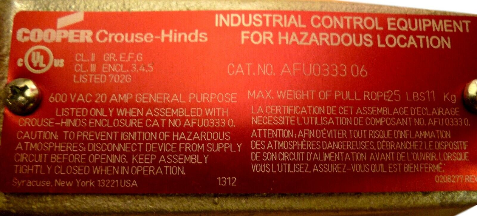 Cooper/Crouse Hinds AFU0333-06 AFU033306 Conveyer Switch AFU0333
