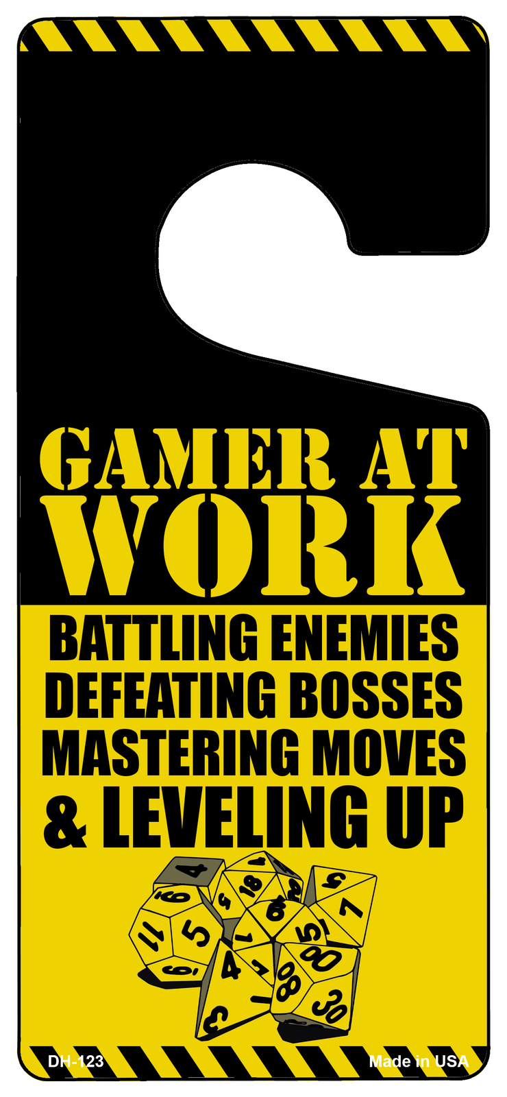 Gamer At Work Dice Novelty Metal Door Hanger. 4" x 9" high gloss metal door hanger. Made of the highest quality aluminum for a weather resistant finish. It is lightweight and durable. Pre-cut hole fits most doorknobs. Individually shrink-wrapped and proudly made in the USA.