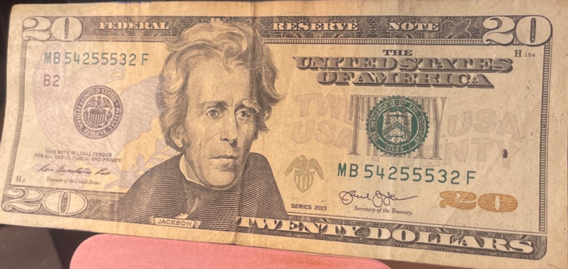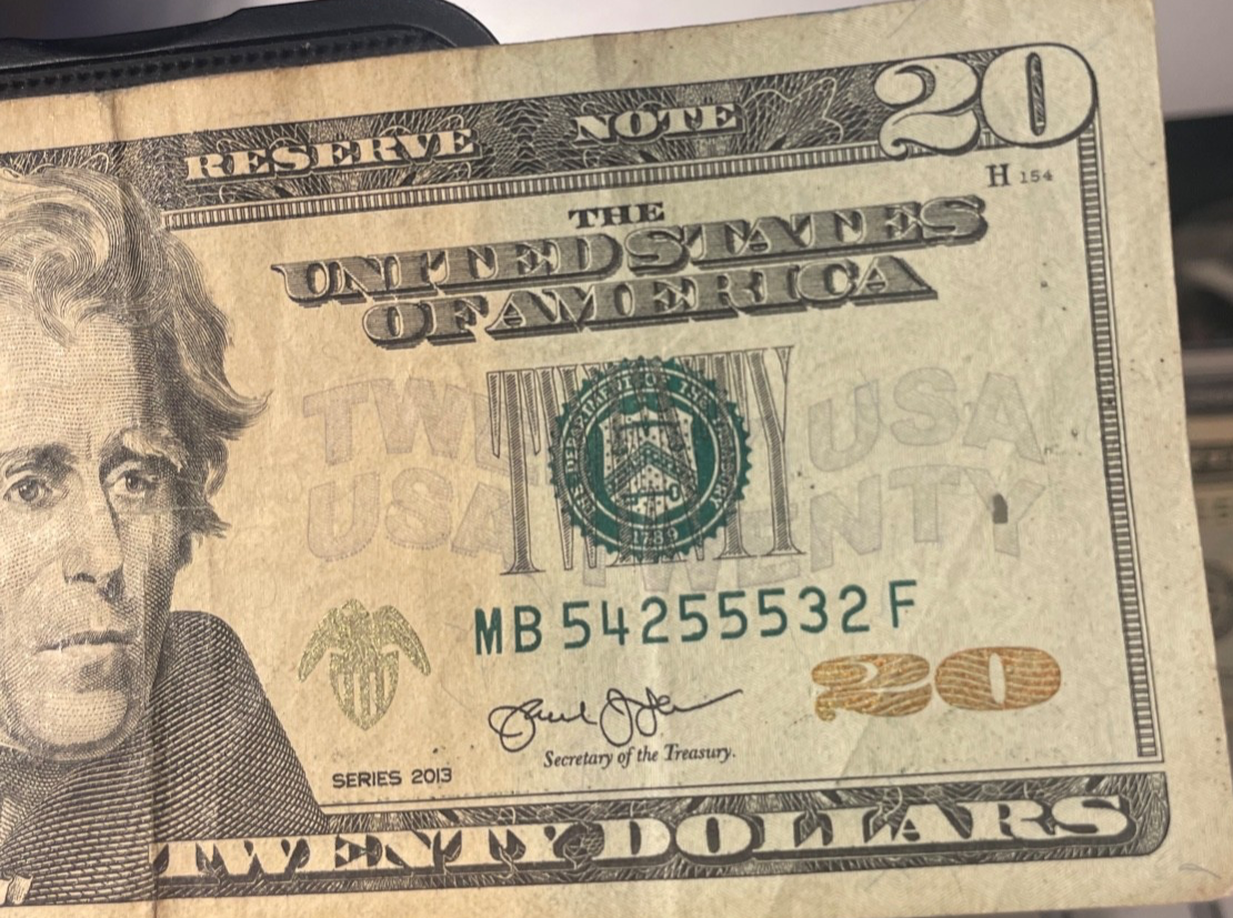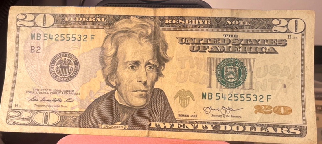 The product is a circulated $20 Federal Reserve Note from 2013 with the serial number MB 54255532. This banknote features a fancy number and is of ungraded grade designation. It is uncertified and originates from the United States. This note is considered a collectible item for those interested in US currency.has center fold and a tiny pin hole.