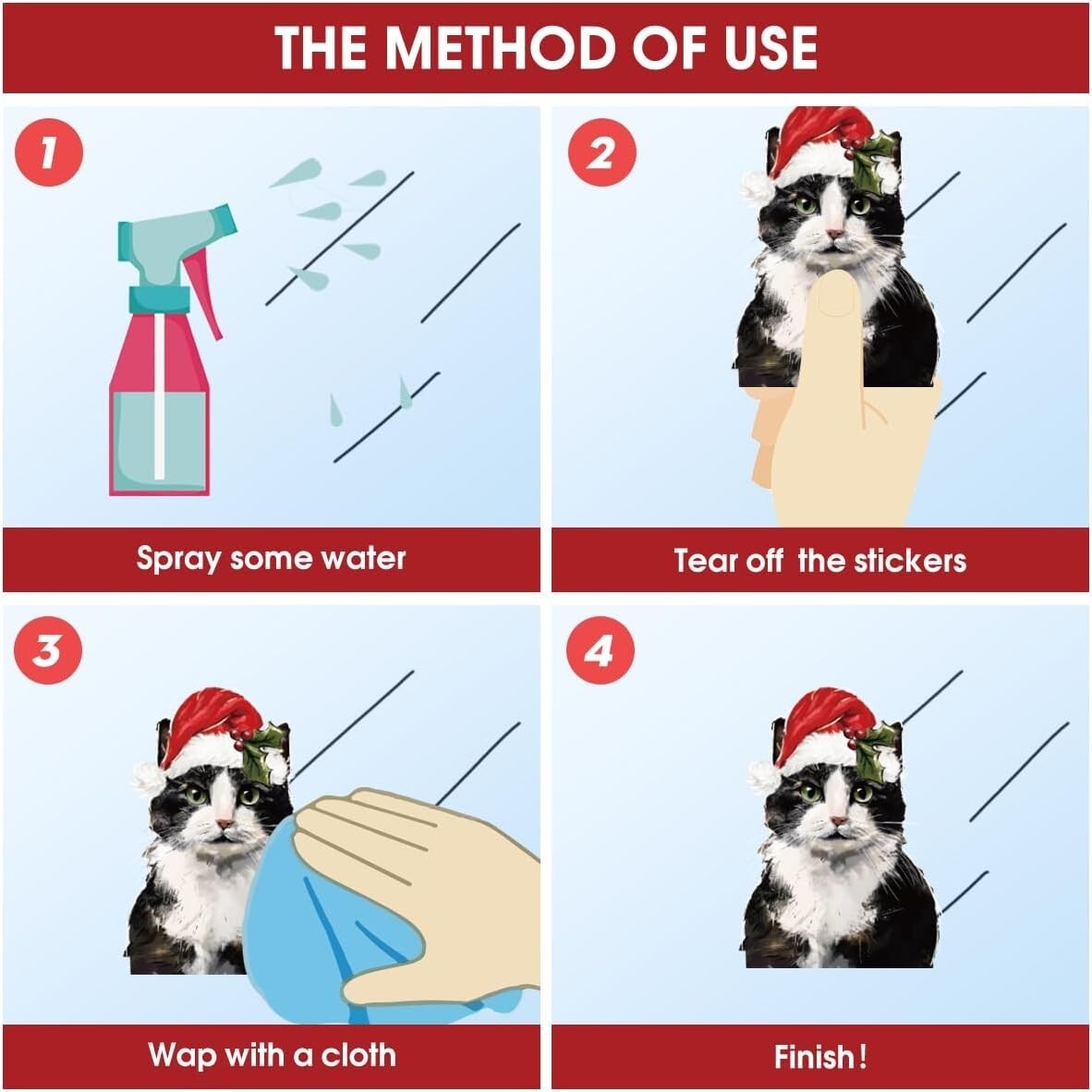Keep smooth surface clean, tear off the back, install stickers with gentle press. You will see sticky clings would firmly attached.