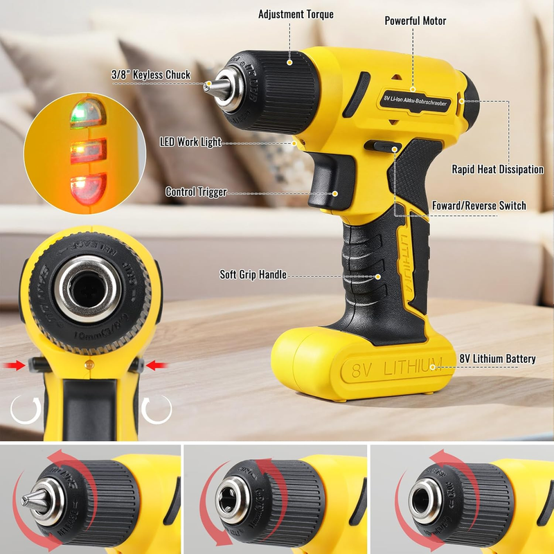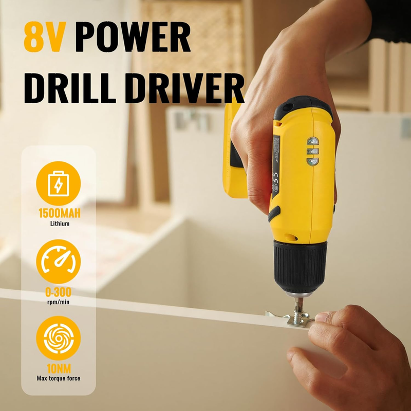 This complete tool kit combines an 8V cordless drill with essential hand tools for common household repairs, assembly tasks, and general maintenance. Ideal for apartments, homes, dorms, offices, and DIY use.