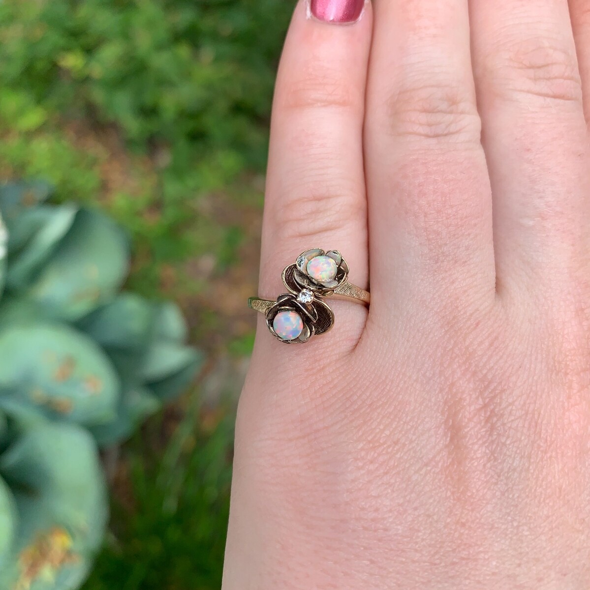 10k yellow gold Australian opal and diamond ring. There are two round cabochon cut opals set in flower settings with a tiny round earth mined diamond accent. The opals measure about 4mm and are very lively with all colors including red play of color. The opals are set with epoxy and there appears to be some lead solder underneath the flower settings.