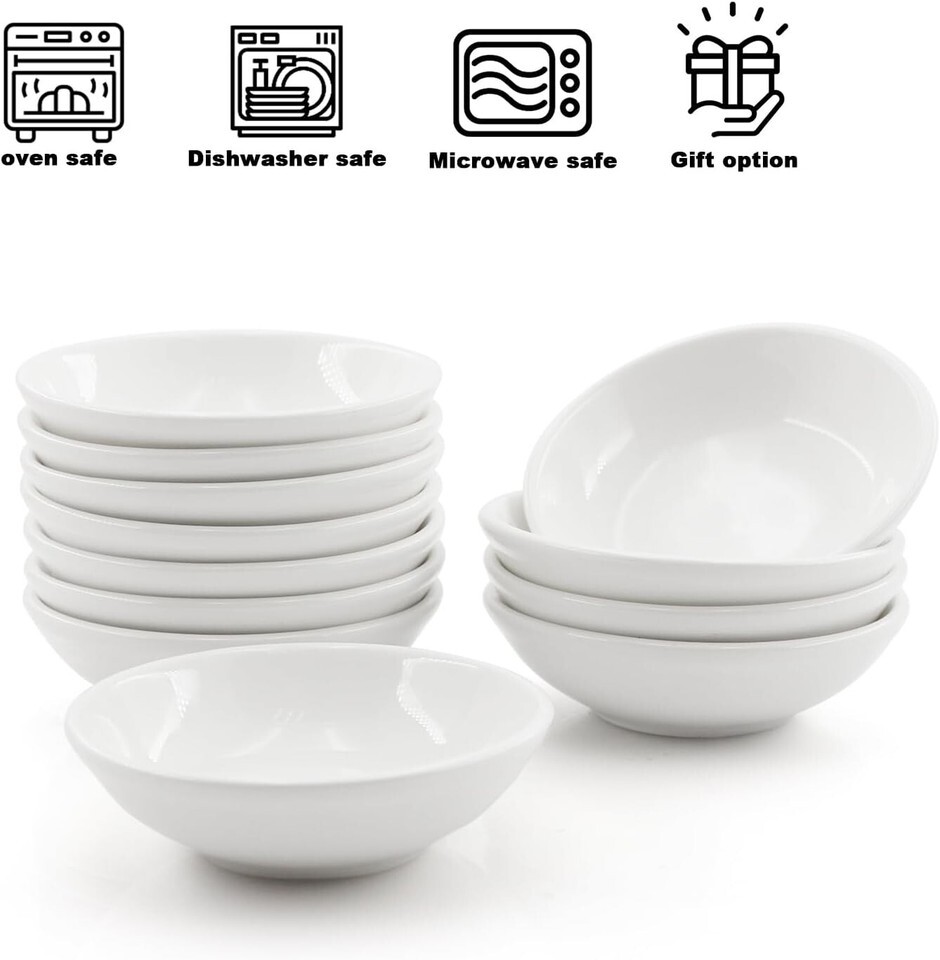 About this item ?Package includes - 6 pack 1.2 Oz stylish white porcelain ramen, lightweight and not bulky, measuring 3 x 3 x 0.8 inches. Ideal for holding a variety of sauces. ?Material - Made of durable professional grade porcelain, safe for microwave/dishwasher/oven, safe and non-toxic, protecting everyone's health. ?Convenient to live - With a corrosion-resistant glass surface, it is easy to clean, and you won't flip the sauce easily because there is a stable bowl bottom and stackable sizes can be effectively stored in a small space. ?Versatile - Ideal for everyday use, suitable for ketchup, salsa, potato paste, desserts, condiments, ranch sauce, soy sauce sushi, bread dips, appetizers and chocolate syrup.