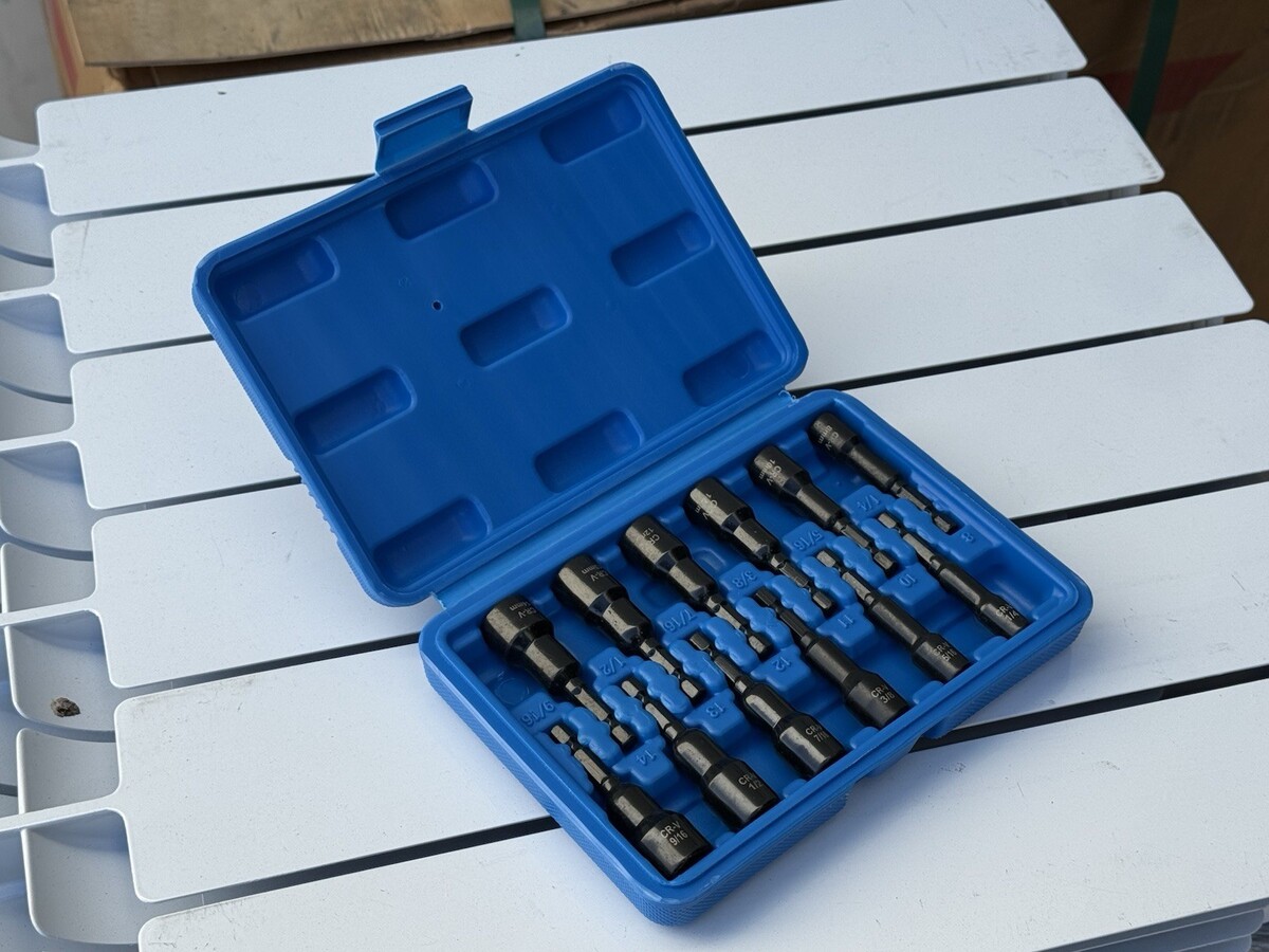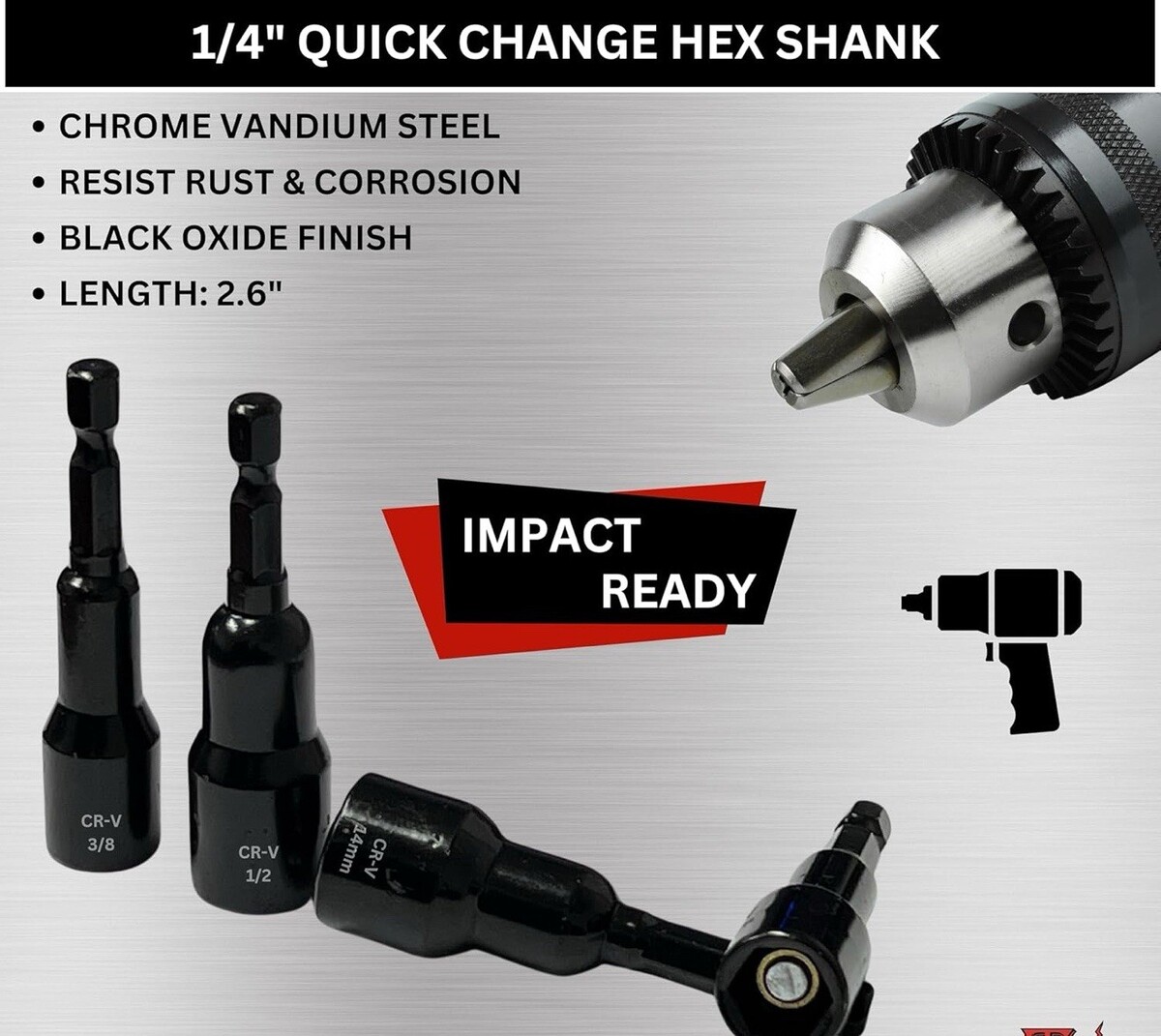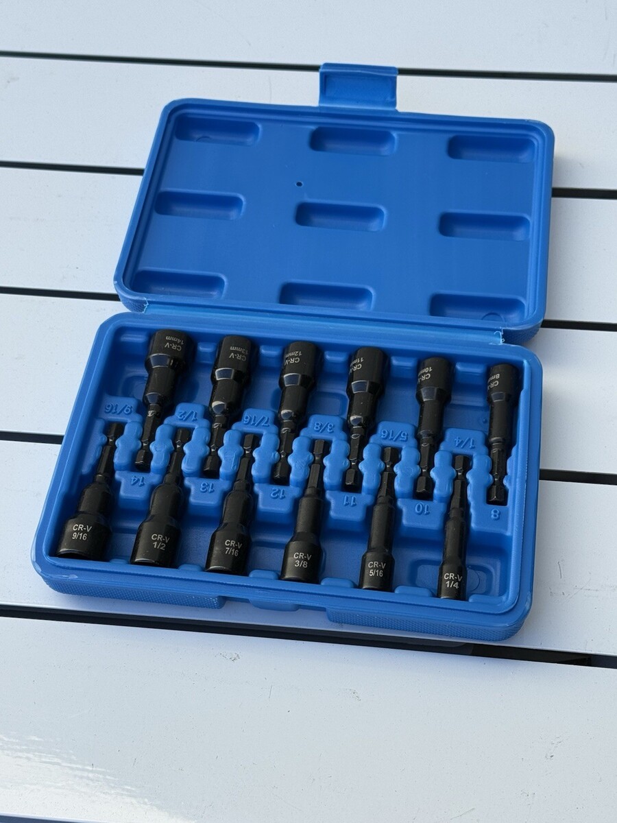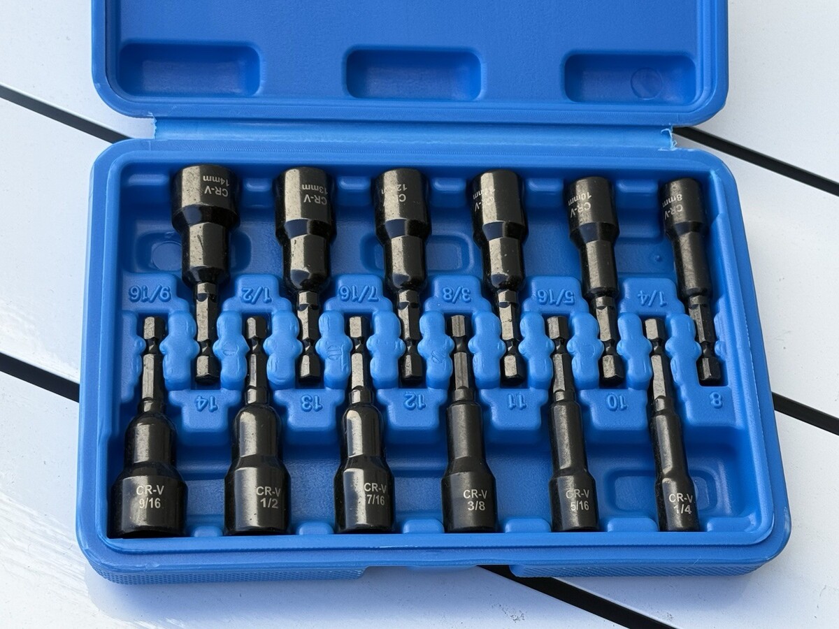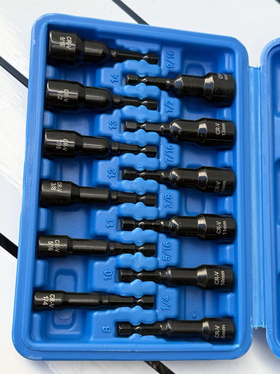 12 Piece Magnetic Nut Driver Set {SIZES} - Set includes: (SAE: 1/4", 5/16", 3/8", 7/16", 1/2", 9/16") | (METRIC: 8mm, 10mm, 11mm, 12mm, 13mm, 14mm) {INDUSTRIAL GRADE} - Constructed using High Quality CR-V Steel (Chrome Vanadium Steel) with a Black Phosphate Coating for durability. High Strength, Anti-Corrosion, and Abrasion Resistent to Ensure Consistency. {SPECIFICATIONS} - Nut Setters are approximately 2.6" in Length, long enough to safely lock and hold onto your drill. Firmly fastening or loosening your nuts/bolts everytime. With a 1/4" Quick-Change Hex Shank, save time during projects. Fits most quick change chucks and drills. {FEATURES} - Each Unit is Visibly Marked with their Size. Blow Mold Case also Labeled with Sizing for Proper Storage. Nut setter's Magnetic feature secure and provide better work efficiency, effortlessly install or remove hexagonal nuts and fasterners. Our 12pc Magnectic Nut Driver Set is a convenient set to have, perfect for the Professional or DIY Individual.