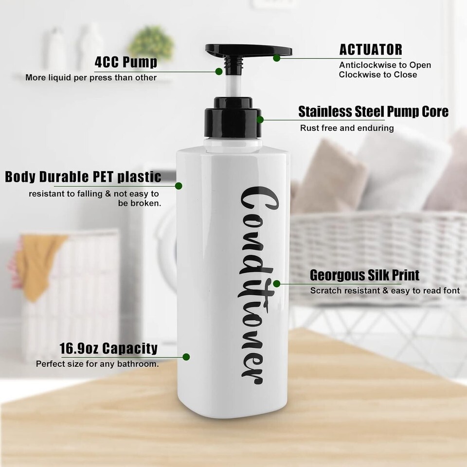 ??Large Capacity Fine Silk Screen Printing?: Our pack of 3 shower dispenser holds 16.9oz reasonable large capacity to meet the whole family daily essential needs. Our shampoo and conditioner bottles features strong and fancy labels made to last and printed with a high-quality silk printing machine, indicating SHAMPOO, CONDITIONER and BODY SOAP can help you identify them easily.