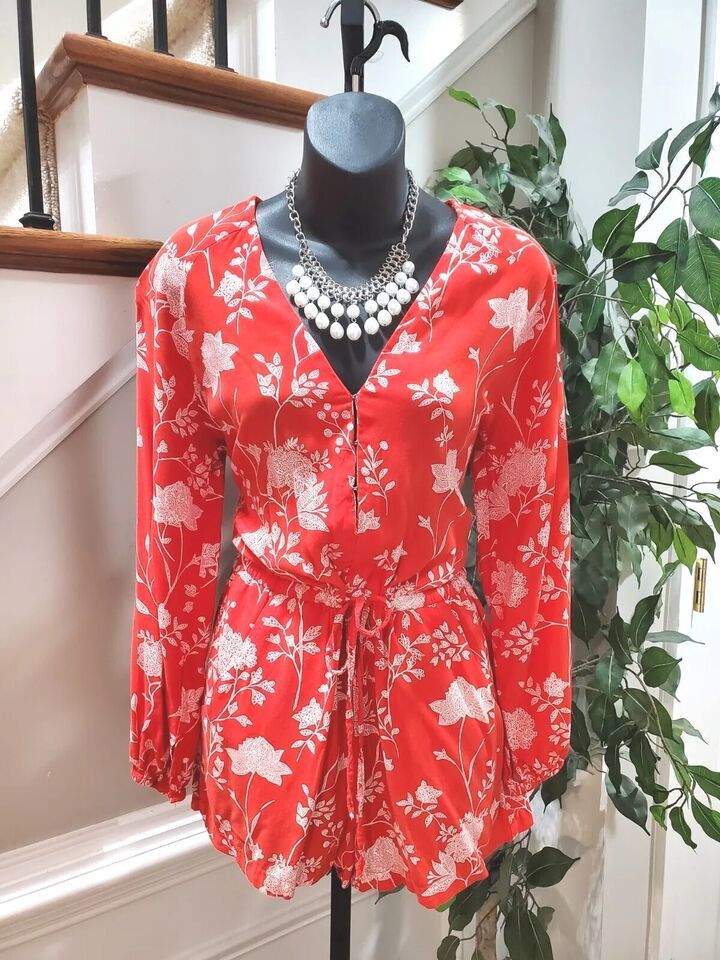- H&M Women's Red Floral 100% Viscose V-Neck Long Sleeve Casual Romper Size 8