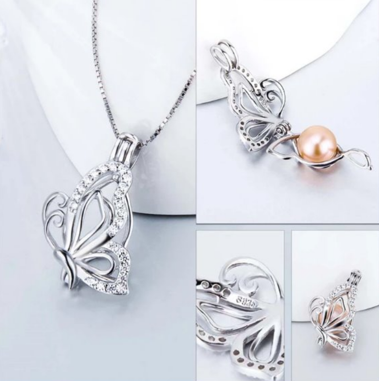 - Dazzling 925 Sterling Silver Zircon Butterfly Pearl Cage Pendant Necklace