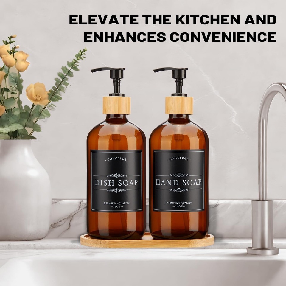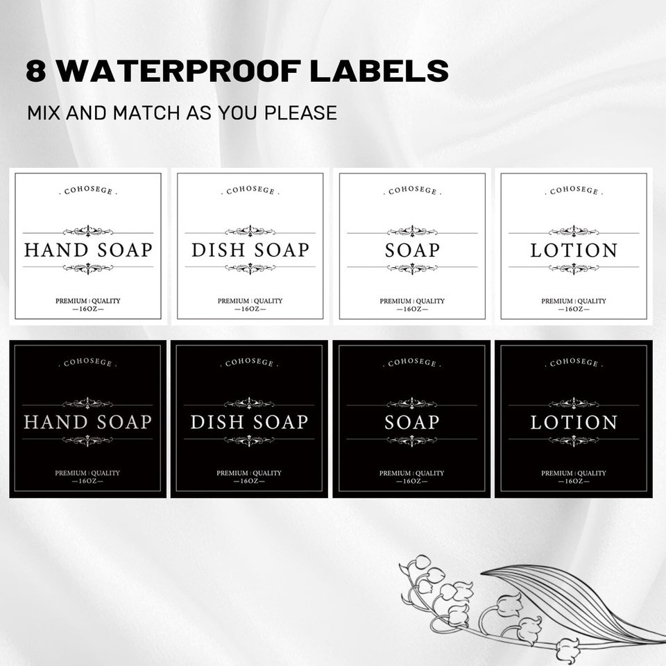 ?8PCS WATERPROOF ELEGANT LABELS IN 2 DIFFERENT COLORS : COHOSEGE offers a set of 8 elegant waterproof labels for each soap dispenser. These labels are designed to effectively resist moisture, ensuring they stay securely attached without wrinkling, warping, or breaking. They not only contribute to a tidy and clean kitchen or bathroom but also add a touch of vintage charm to the amber glass soap dispenser.