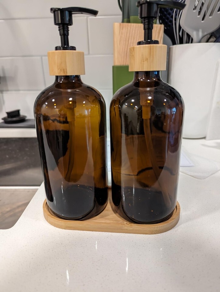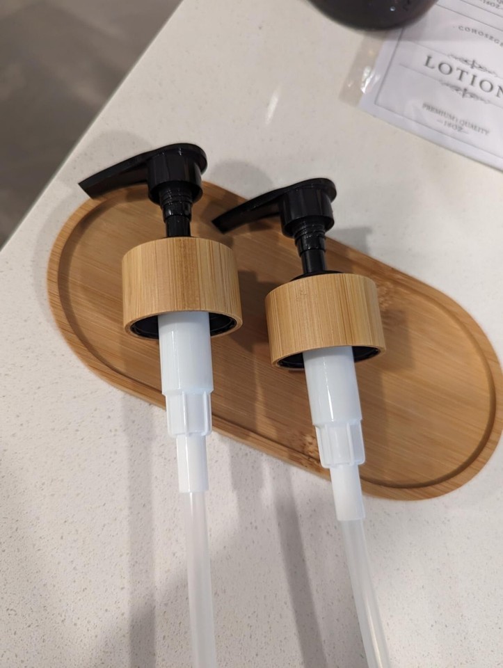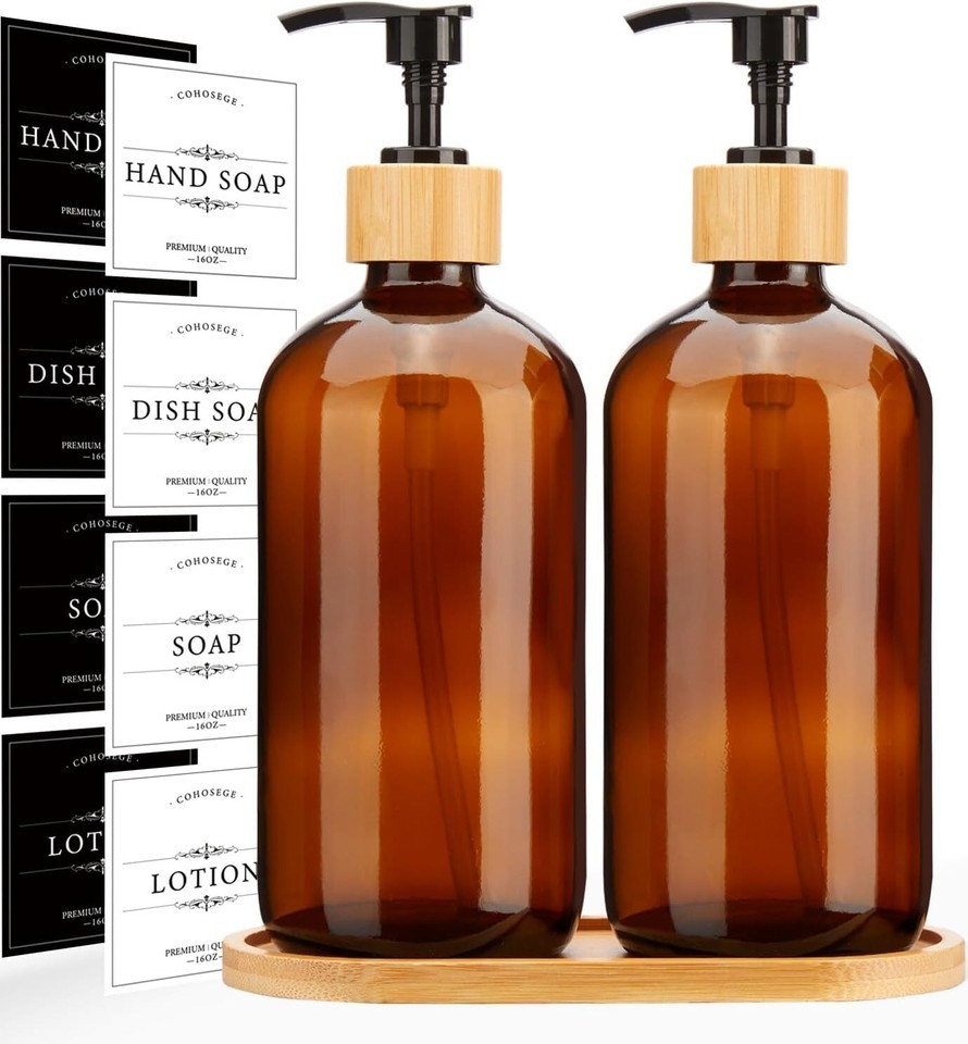 ?HIGH-QUALITY GLASS BOTTLE NOT CHEAP PLASTIC: Our soap bottles are made of high-quality glass, not cheap plastic. This soap dispenser set is safe and natural to fill with a variety of liquids repeatedly. It comes with a bamboo tray and waterproof labels.The 2cc bamboo pumps is rust-free and highly durable, providing a safe and leak-proof experience. And we offer a surprising price that offers great value for money!