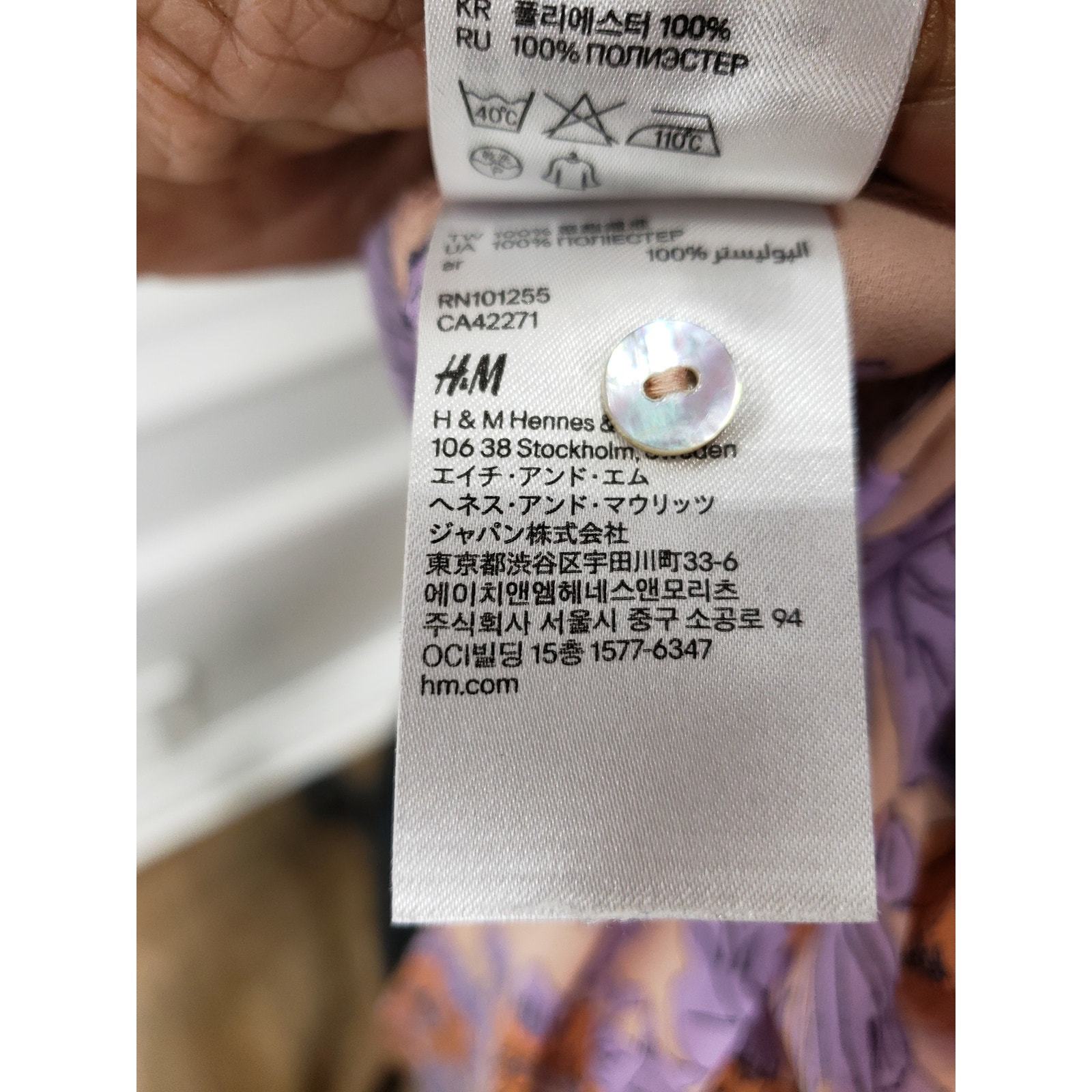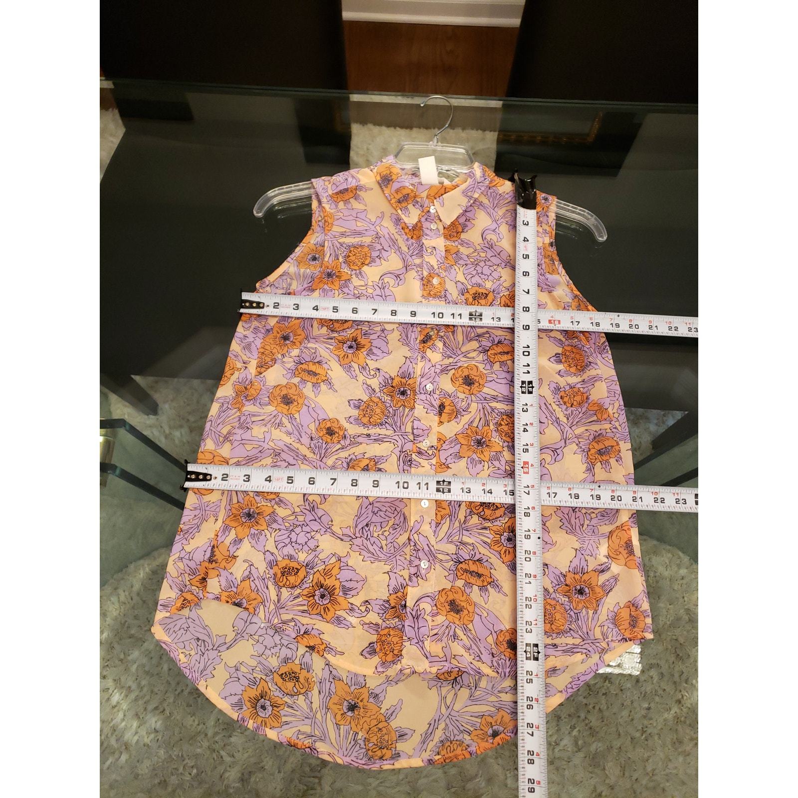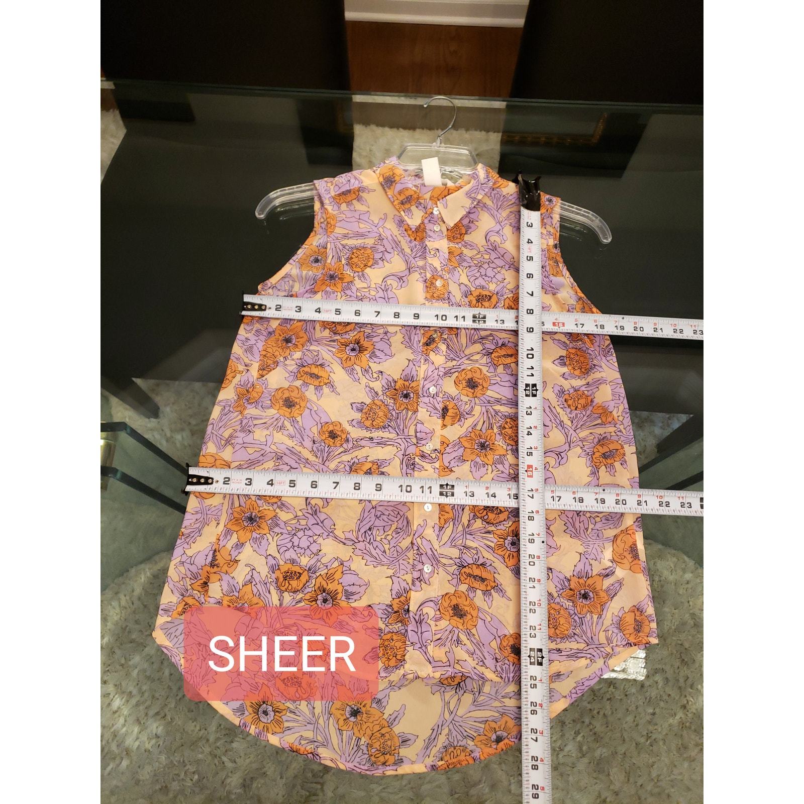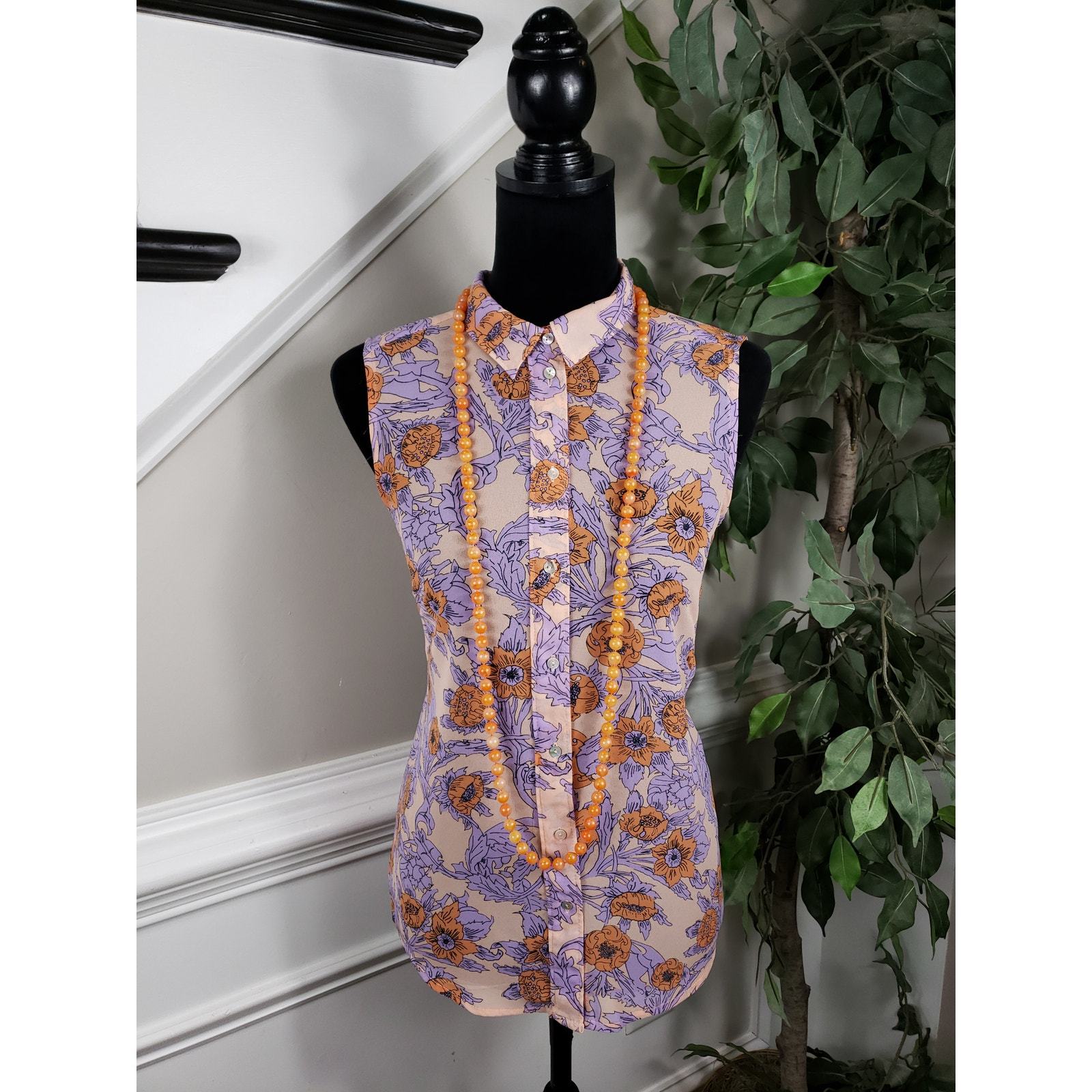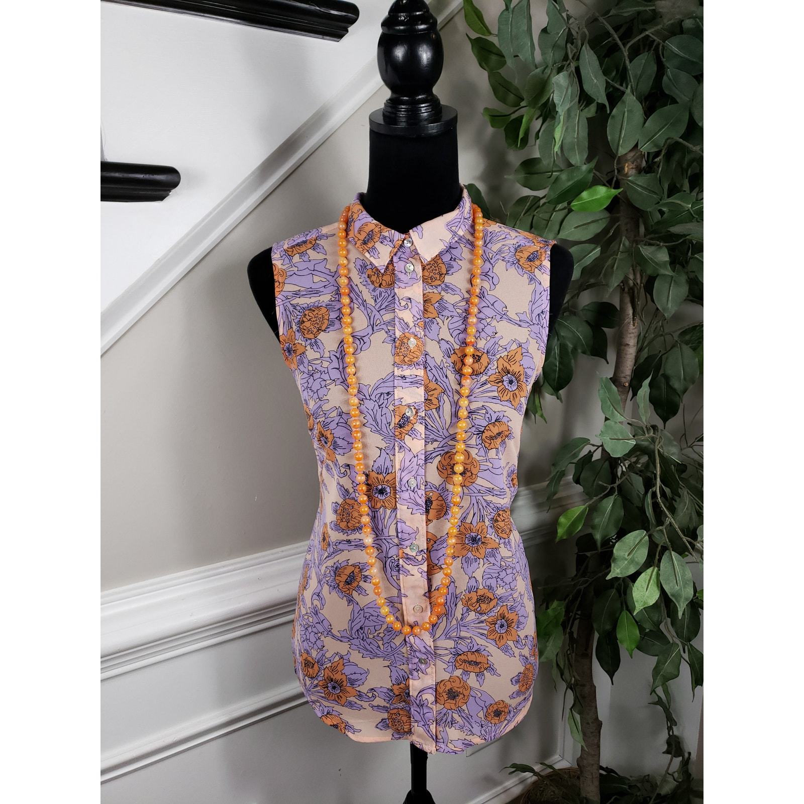 This beautiful sleeveless button-down shirt by H M features a striking floral print in shades of purple, orange, and beige. The soft sheer fabric adds a delicate touch, making it a perfect choice for layering over a camisole or wearing on its own for a chic, relaxed look. The vibrant floral pattern, along with the button-up front, gives this shirt a polished yet breezy vibe that is ideal for warmer weather. Made from 100% polyester, it is lightweight and comfortable, making it a versatile addition to your wardrobe.