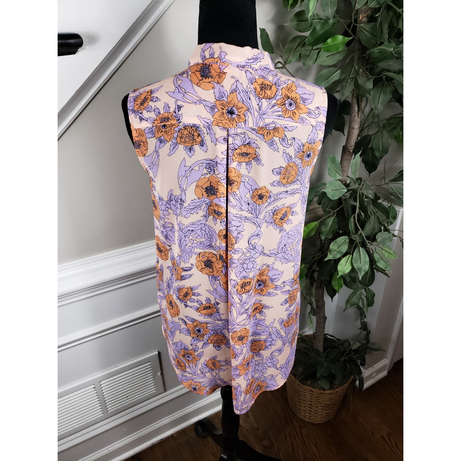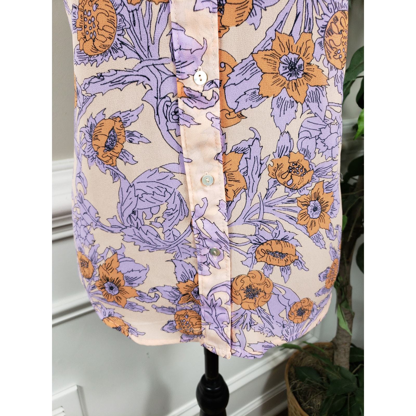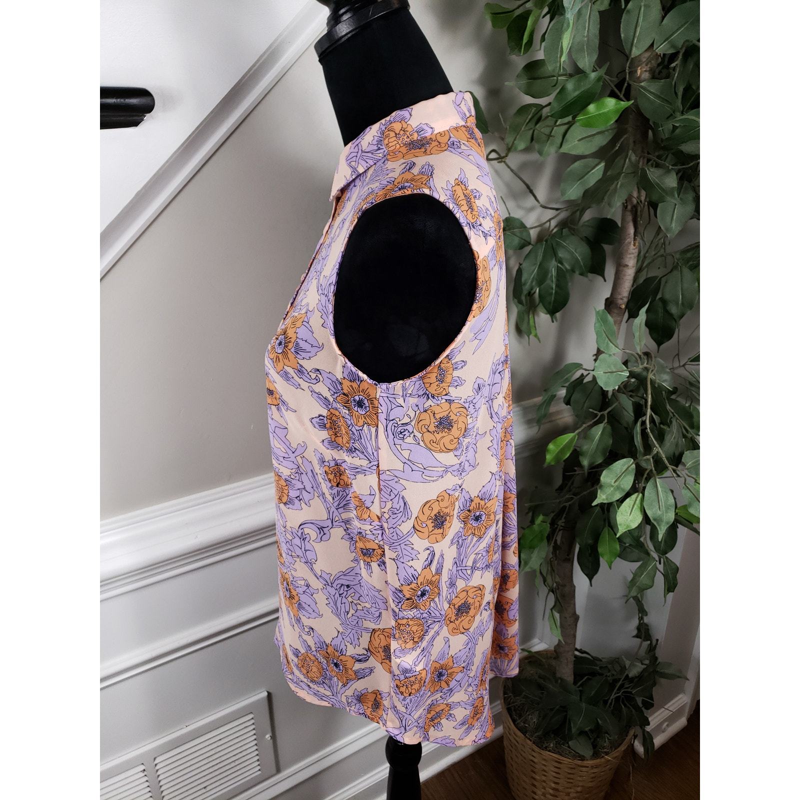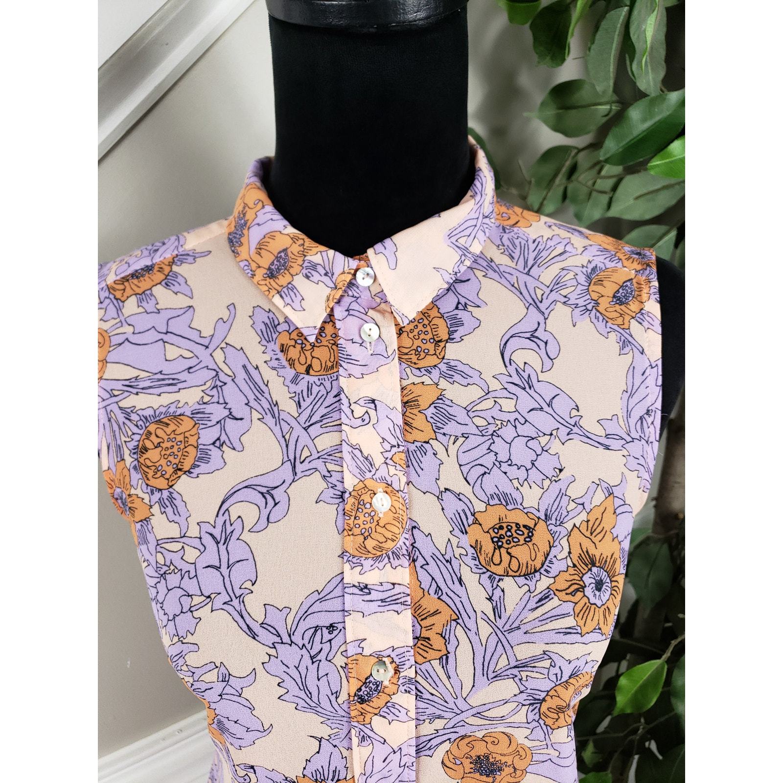 H M Women Size 6 Purple Floral Button-Down Sleeveless Shirt Top Sheer