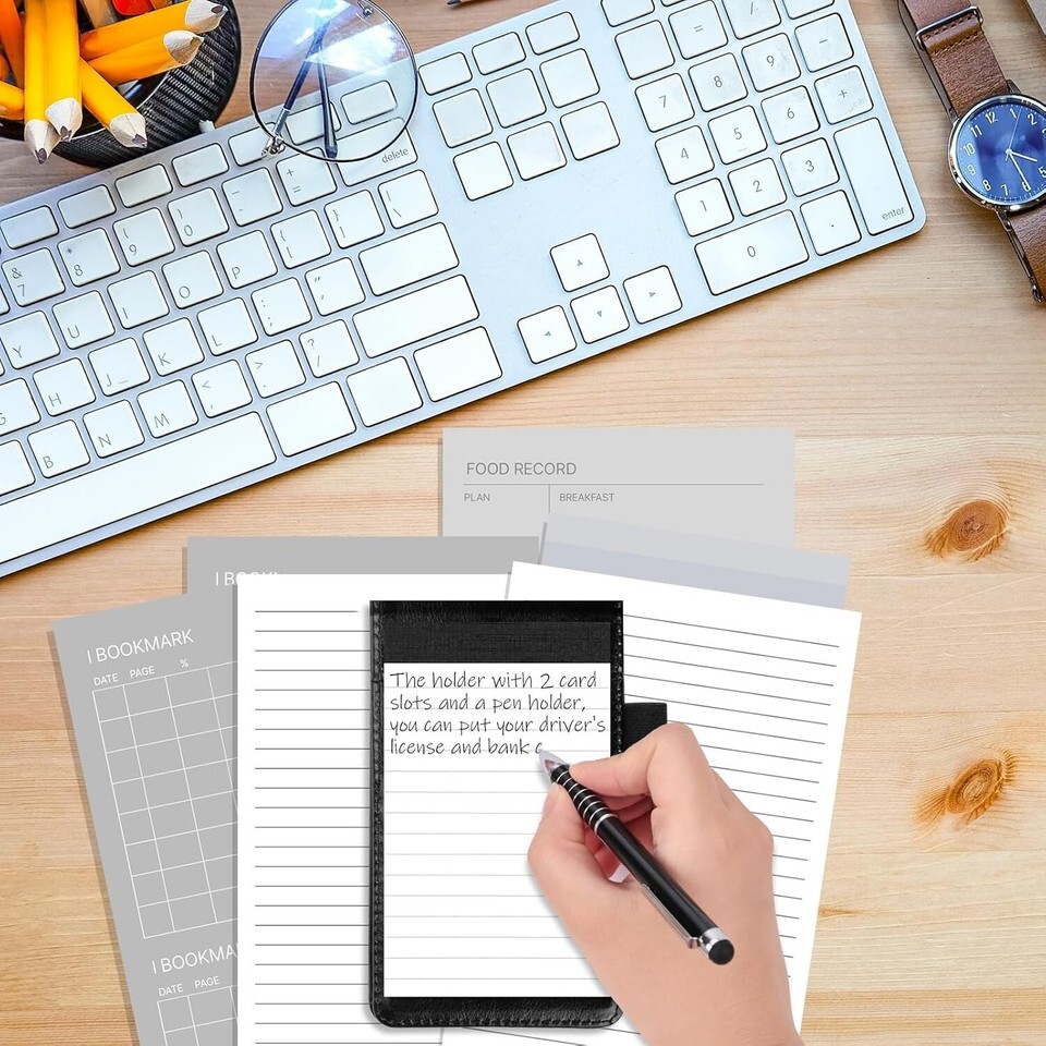 About this item Super Value Pack - This package includes a mini pocket notepad holder with 50 lined sheets, a durable metal pen, and 9 memo book refills, each containing 30 lined sheets. The ruled pages offer comfortable writing space, making it perfect for various occasions such as business meetings, conferences, office work, and travel. All-in-One Convenience - Keep all your essentials in one place with this mini pocket notepad. The inside cover of the notepad features a versatile design, including 2 card slots for credit cards and passports. Additionally, there's a side-mounted rubber band to secure your pen. This pocket notepad is an indispensable tool for jotting down notes, attending business meetings, and nurturing your creativity while on the move. High-Quality Material - This compact notebook is crafted from PU leather, known for its strength and durability, ensuring the flip notepad maintains its shape and resists breakage over time. The included metal pen provides a smooth and comfortable grip, allowing you to maintain an elegant feel at all times. Portable and Convenient - This mini pocket notepad holder measures 3.4 x 5.5 inches, with each paper measuring 3 x 5 inches. The small PU leather notebooks are incredibly compact and lightweight, fitting easily into your pocket, jacket, bag, or any other small space. Ideal for everyday work and outings, the notepad helps keep you organized in your daily life, whether you're at home or on the go. Versatile Usage - This leather pocket notebook set serves multiple purposes, allowing you to record information or ideas while also offering storage for cards, cash, passports, tickets, or pens. The pocket notepad is well-suited for various settings, including office, school, business, travel, meetings, and more.